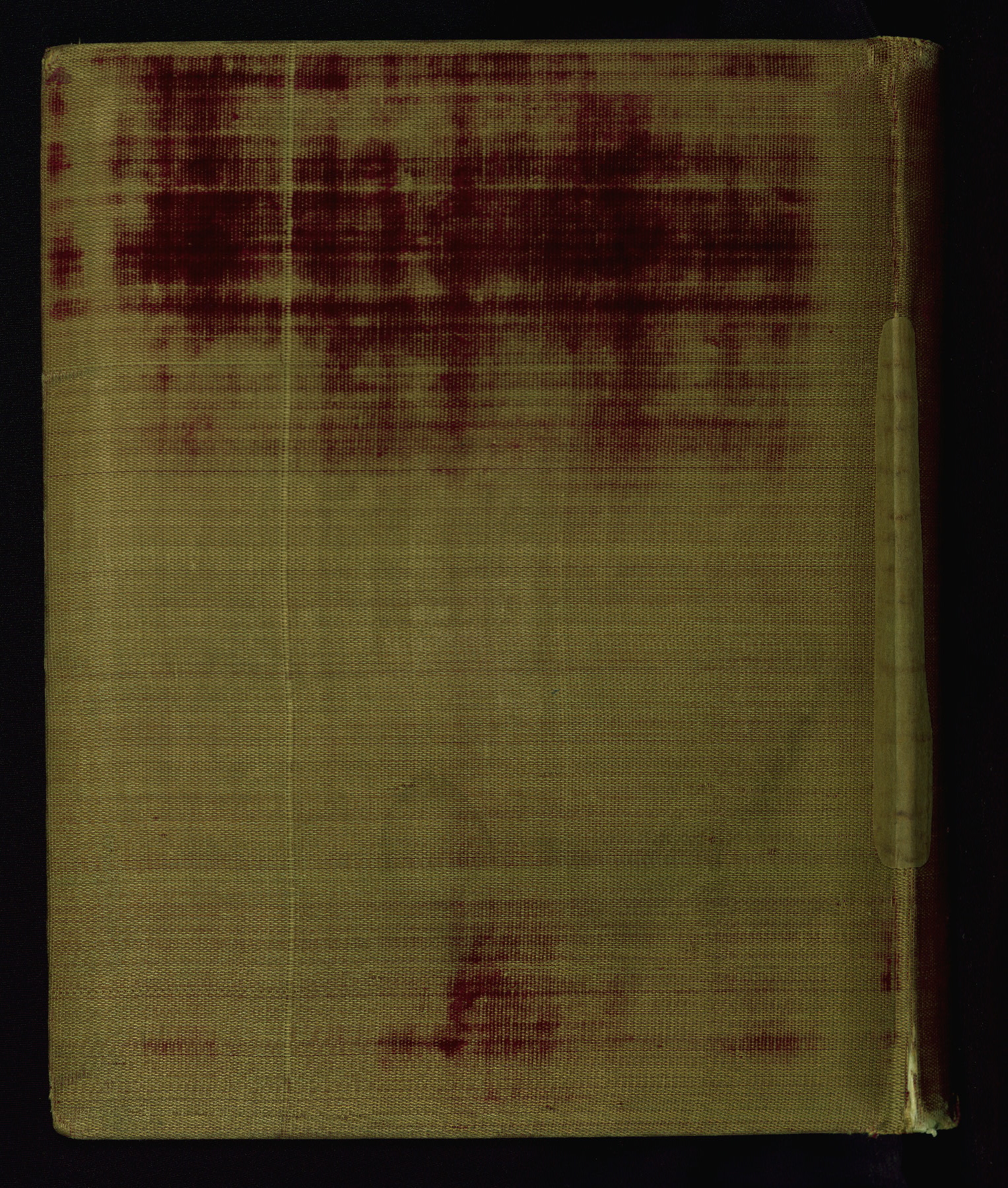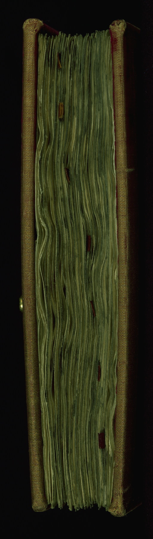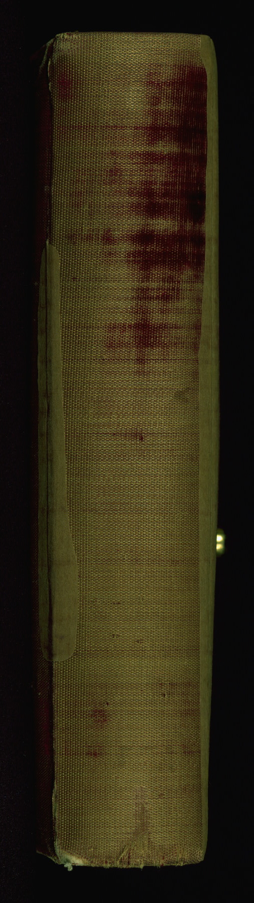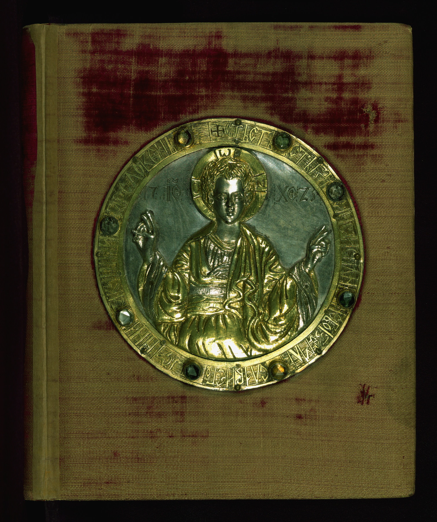 This late nineteenth or early twentieth century red velvet binding added by León Gruel, Paris. The cover was embellished by Gruel with an eighteenth-century silver and gilded plaque of Christ, originally from a Serbian flabellum, and which contains a Slavonic inscription. The front and back pastedowns were taken from an early eleventh-century Central Italian Sacramentary. A description of an earlier cover was recorded in the library catalog of the monastery of Saint-André Villeneuve-lès-Avignon in 1640 by Dom Odon de la Mothe, who described it as "postibus copertum et basana alba a parte putrida".