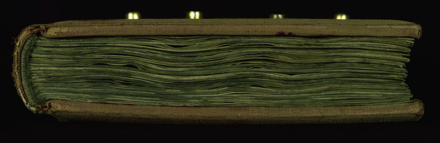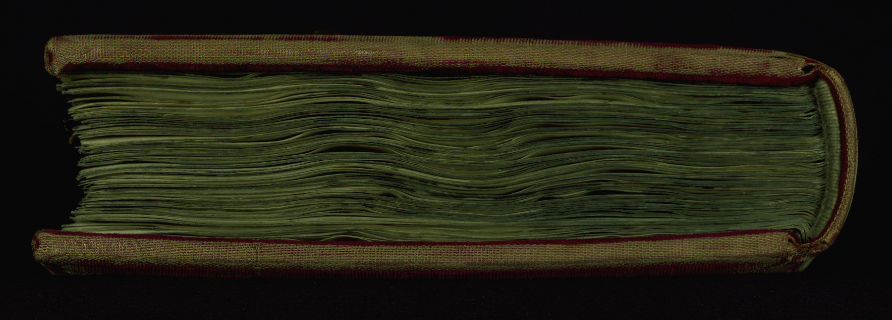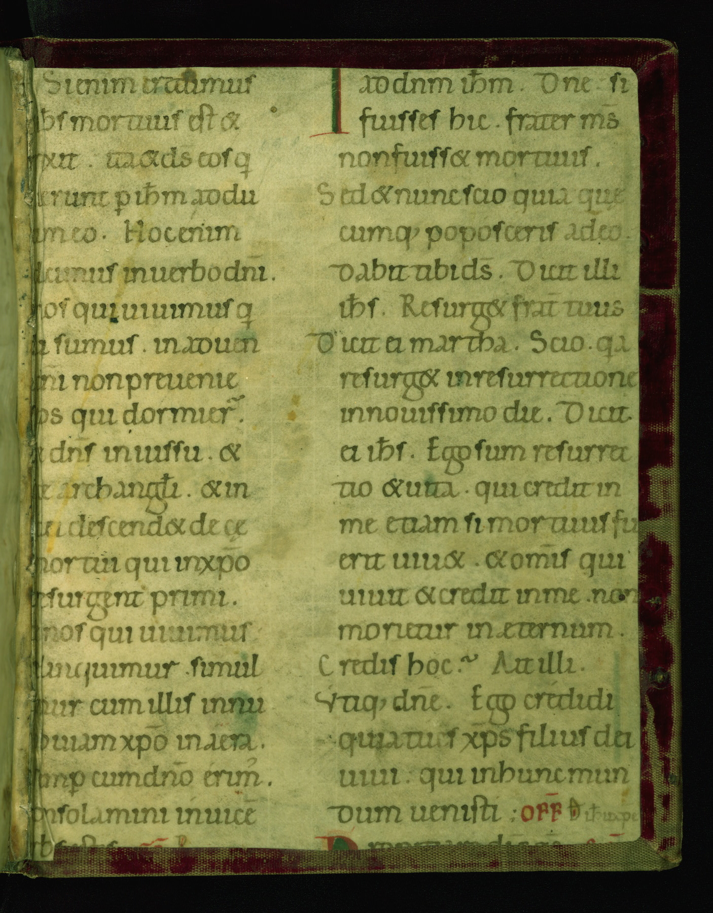 This late nineteenth or early twentieth century red velvet binding added by León Gruel, Paris. The cover was embellished by Gruel with an eighteenth-century silver and gilded plaque of Christ, originally from a Serbian flabellum, and which contains a Slavonic inscription. The front and back pastedowns were taken from an early eleventh-century Central Italian Sacramentary. A description of an earlier cover was recorded in the library catalog of the monastery of Saint-André Villeneuve-lès-Avignon in 1640 by Dom Odon de la Mothe, who described it as "postibus copertum et basana alba a parte putrida".