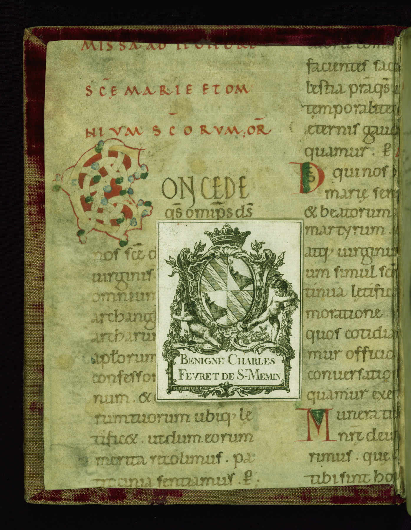 [2] facsimile (?) of bookplate of Bénigne-Charles Févret de St. Mesmin (here spelled 'Memin') of Dijon (1739-1792), affixed in all likelihood by Gruel at time of rebinding, 19th/20th century (?)