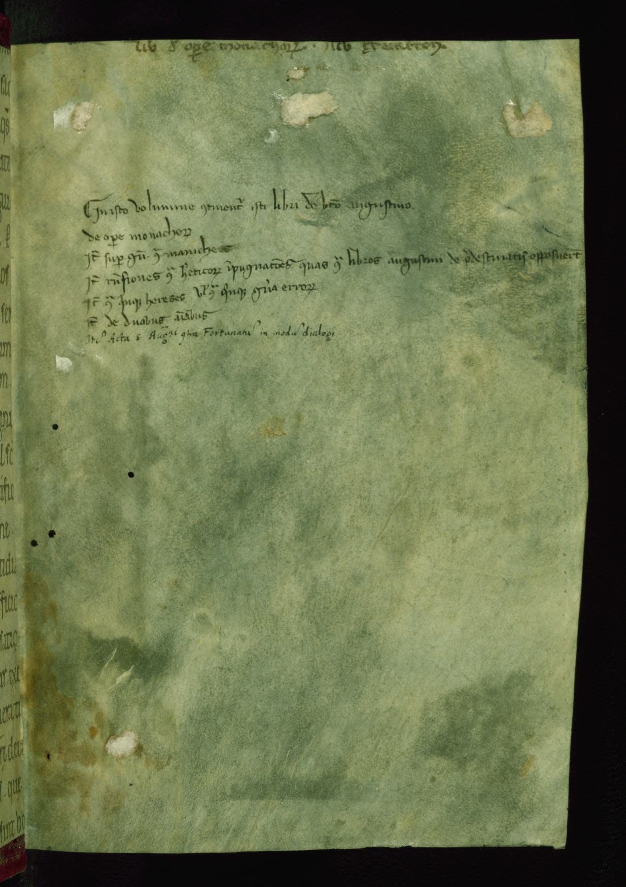 [1] ownership inscription added in 17th century in upper margin of fol. 2r: 'Iste liber est monasterii sancti Andree dyocesis auinionensis / .aab. /; and in another slightly later hand, added after 1635: Monasterii Sancti Andreae congregationis S. Mauri: /; in lower margin, added after 1640: 'Catalogus inscriptus', reference to 36-line description of W. 2 in Saint-André library catalogue begun 29 September 1640 by Dom Odon de la Mothe (d. 1643), binding described as 'postibus copertam et basana alba a parte putrida'