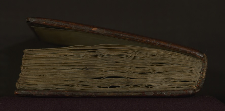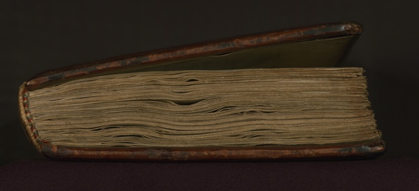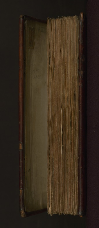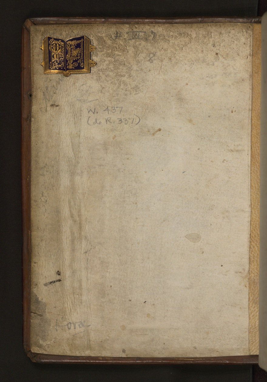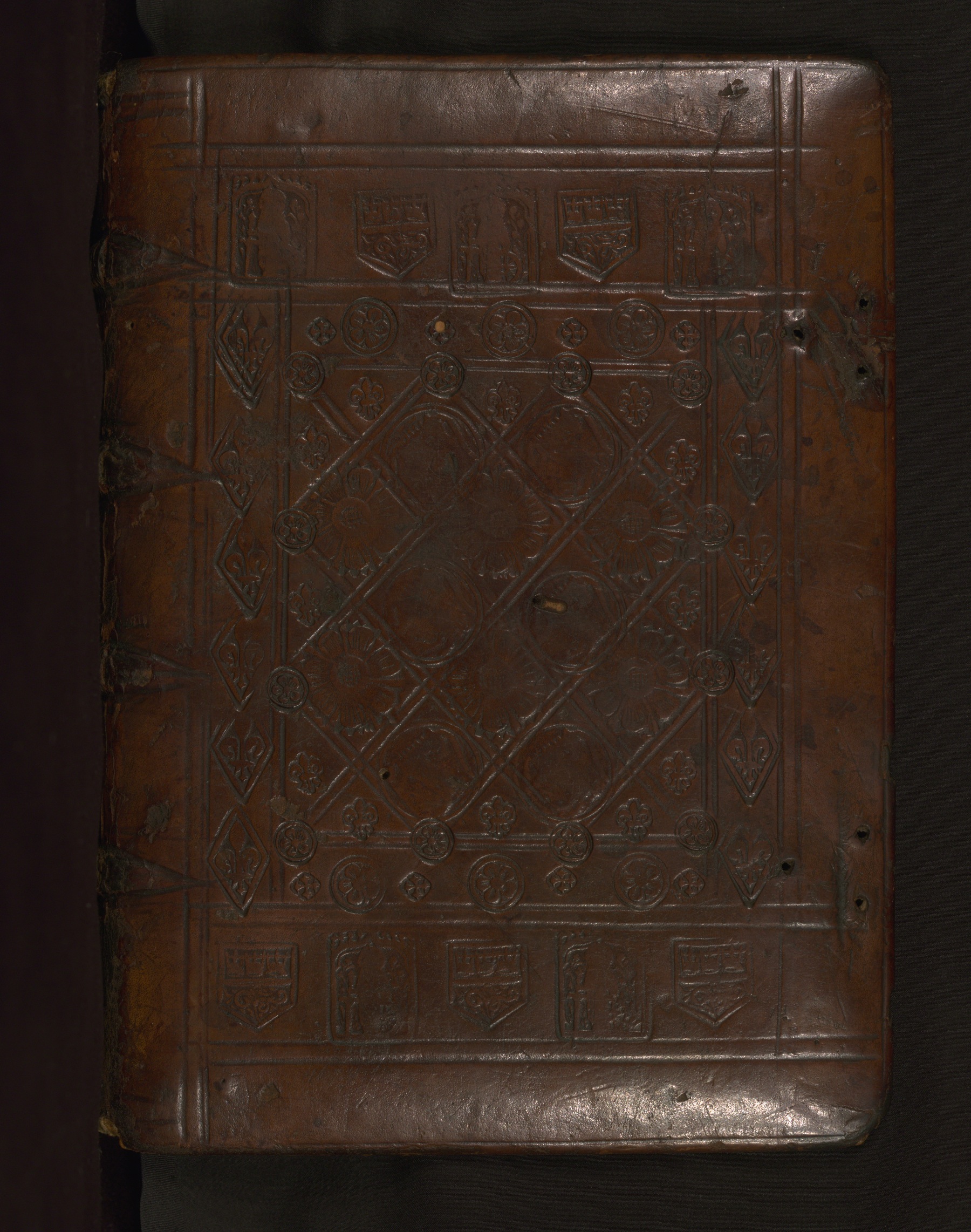This sixteenth century German binding is original to the manuscript. It has brown leather over wooden boards and is stamped with designs of fleurs-de-lis, rosettes, unicorns, Cologne heraldry, and St. Paul under an arch. Holes are visible where clasps (now missing) were originally attached.