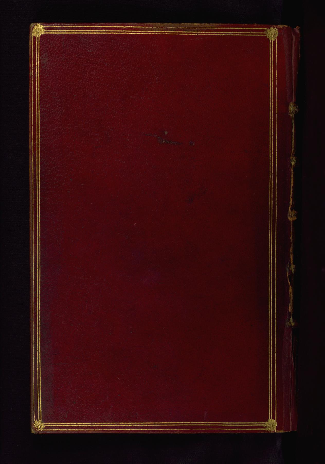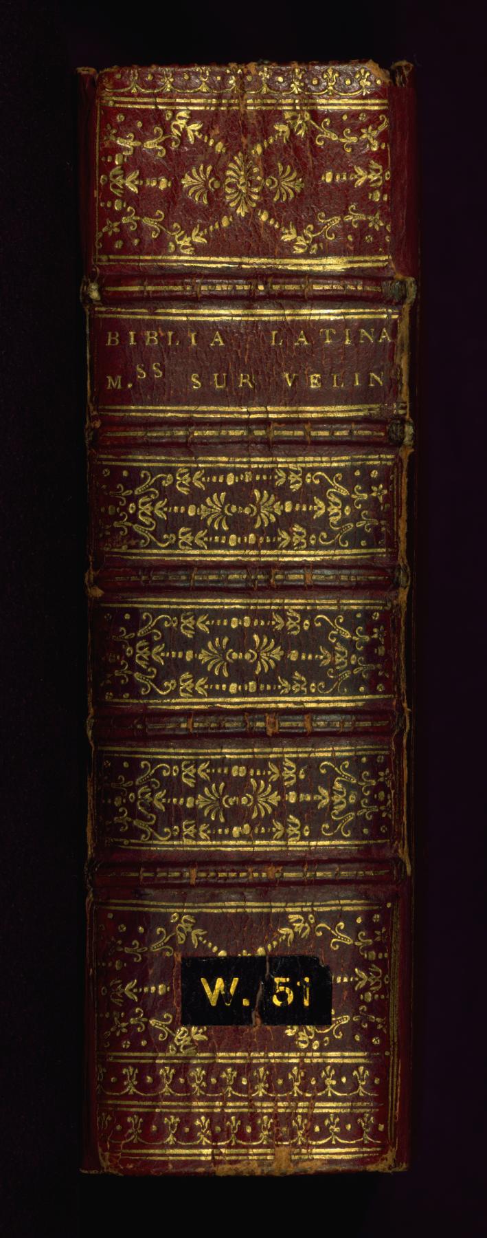 This binding is not original to the manuscript but was added in the Eighteenth-century. It is made of gilt red morocco, with tooled spine and titled "Biblia Latina M.ss sur Velin."