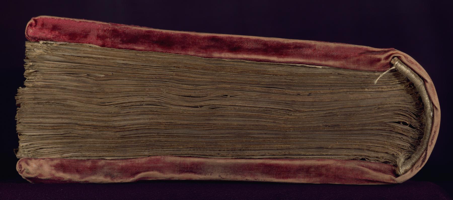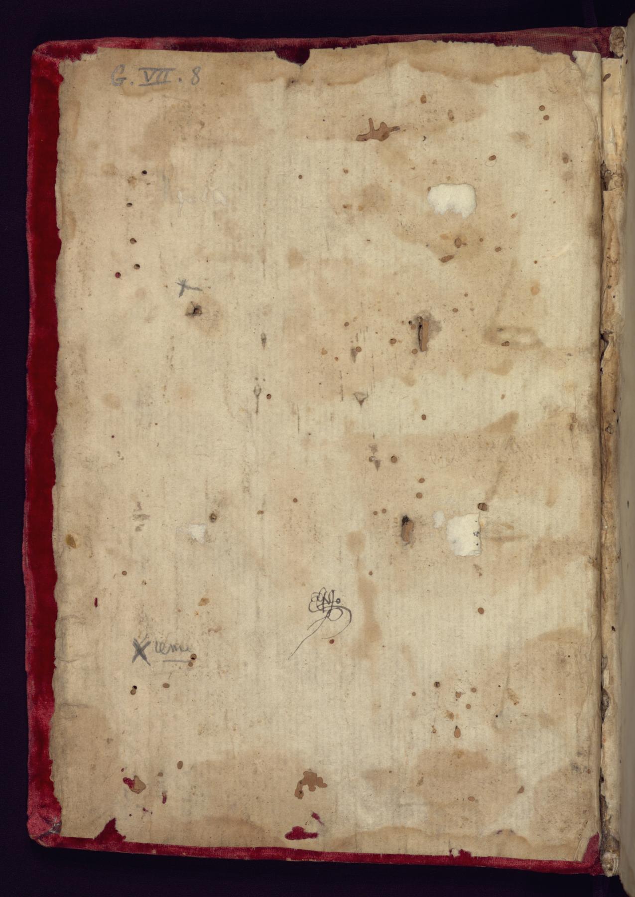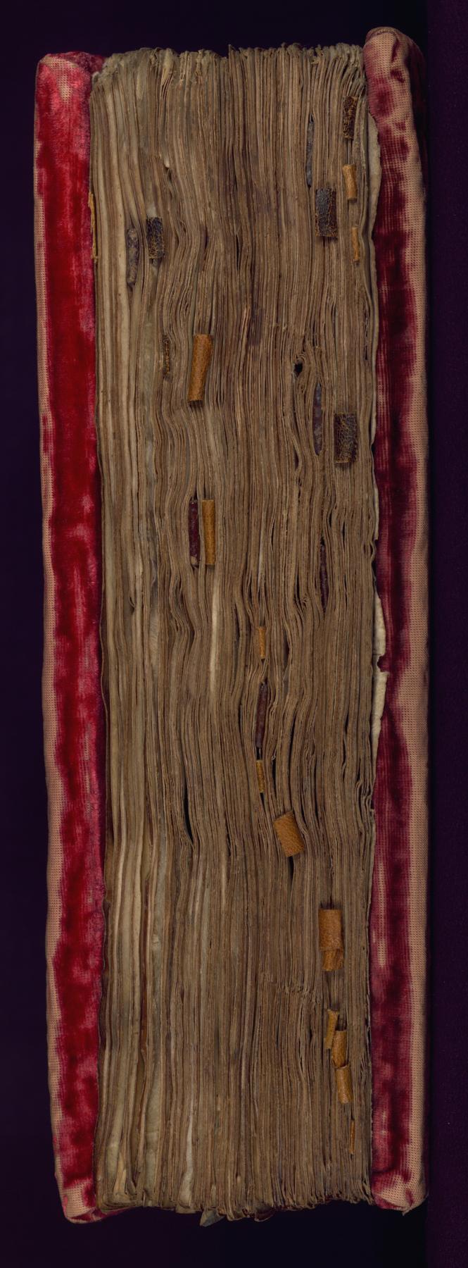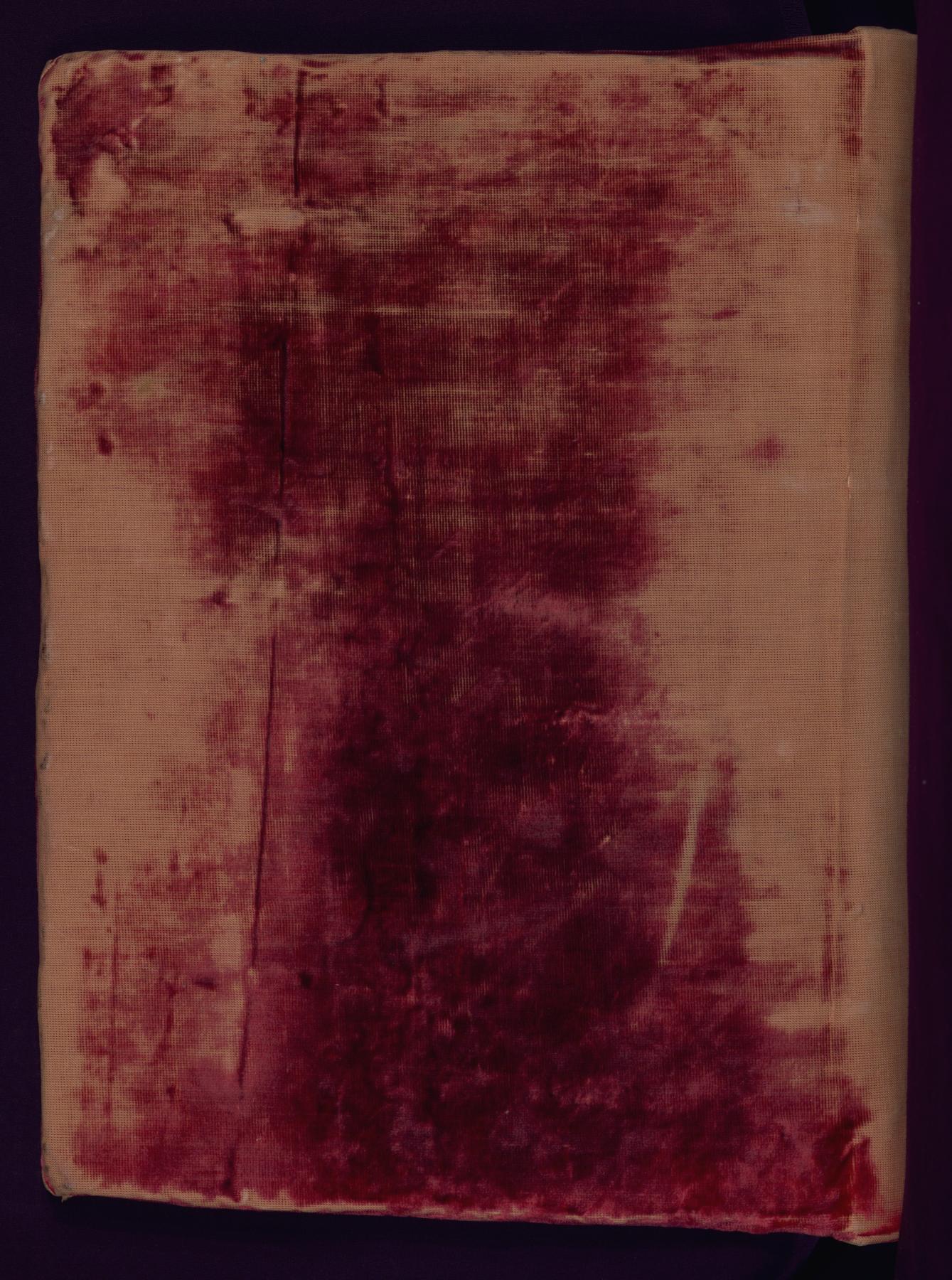 Binding is non-original. Byzantine (?) squared wooden boards covered with red velvet ca. 1920-1930; flat spine; raised endbands; pastedowns and flyleaf of unwatermarked paper