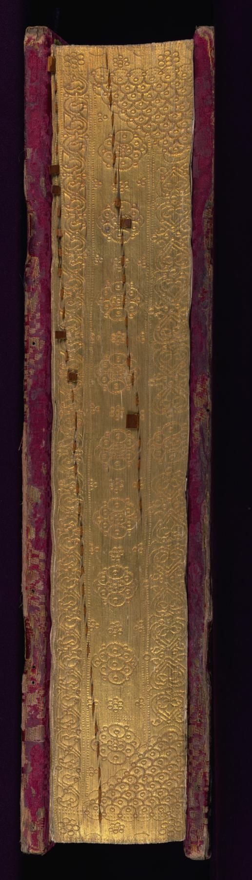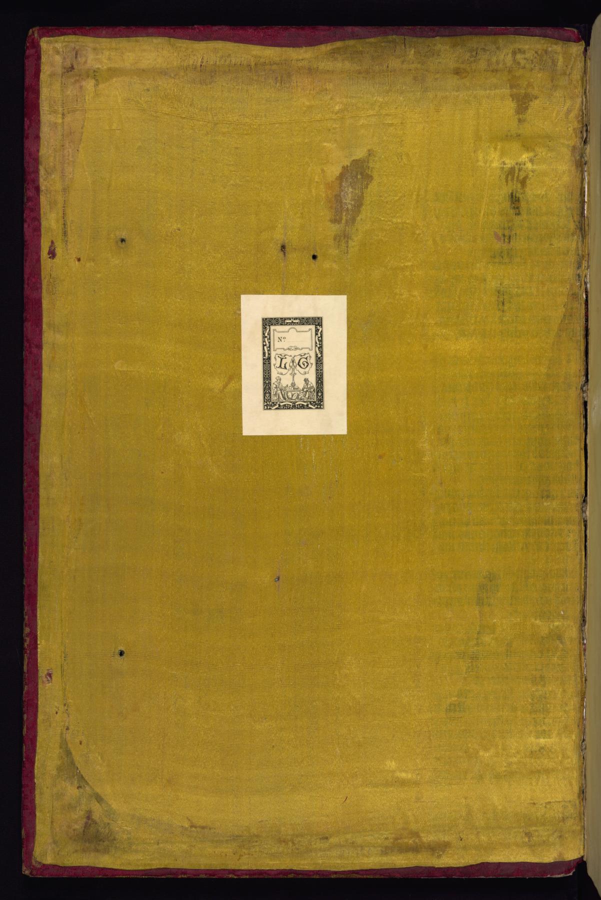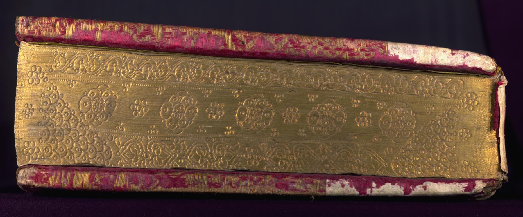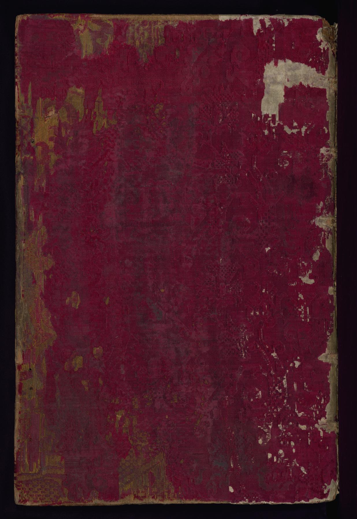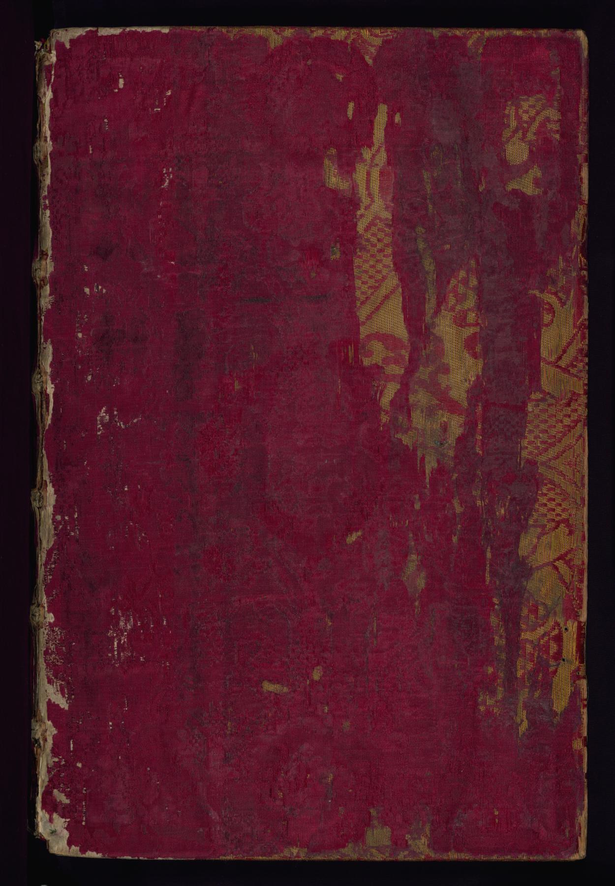 Binding is original and dates to the end of the sixteenth century; pasted down by Liz Bentzel in May 1935; patterned red silk over squared wooden boards; spine raised with six bands; traces of now lost metal attachments and clasps; pastedowns of yellow silk.