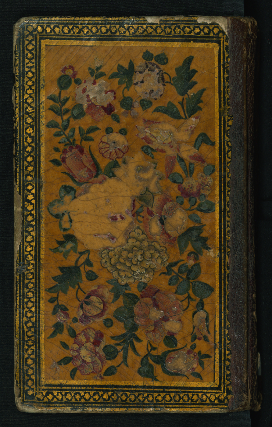 This 19h-century lacquer binding from Walters manuscript W.567 has a floral composition on a gold field on the upper and lower boards. It appears to be contemporary with the manuscript.