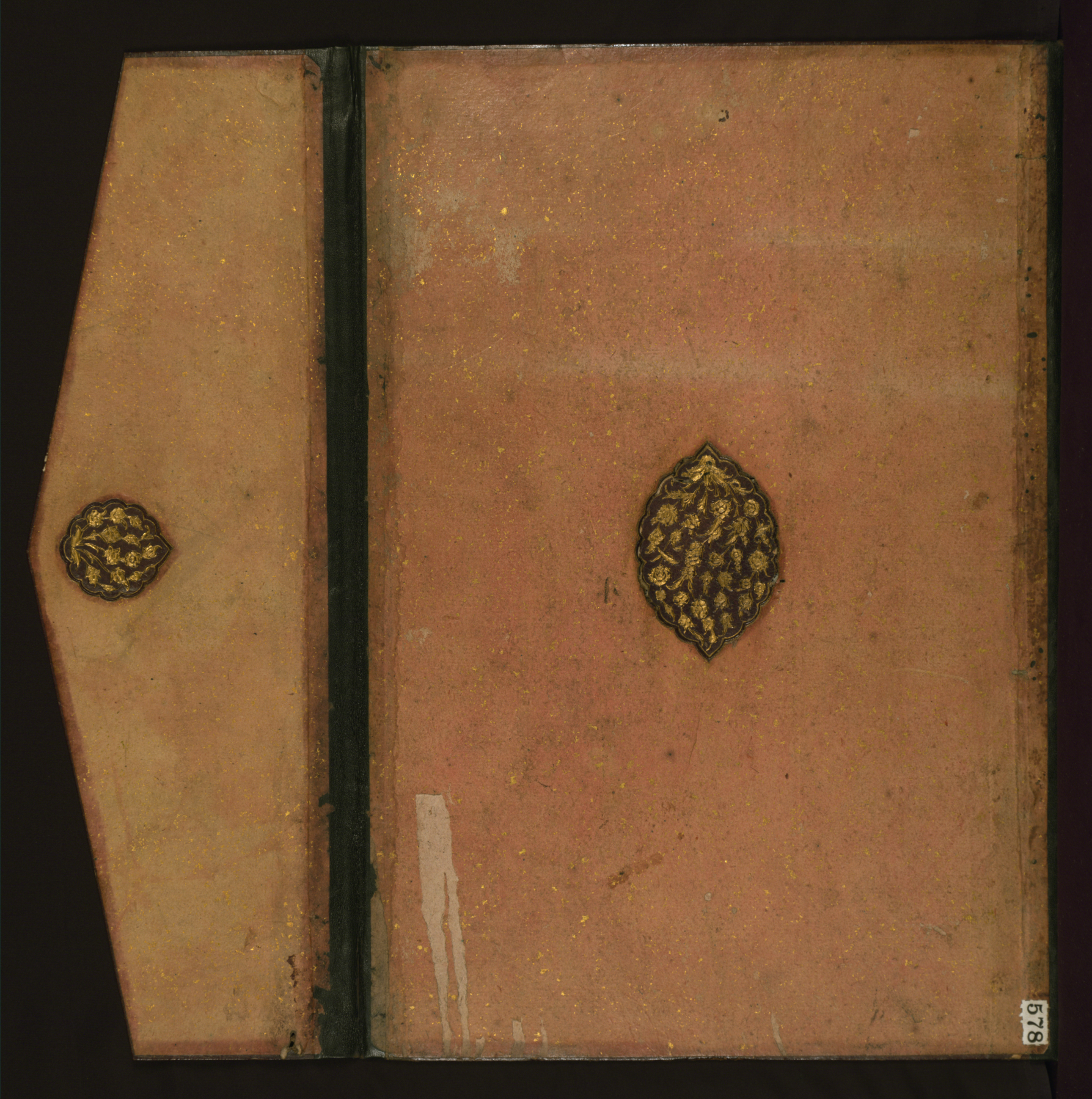 This binding from Walters manuscript W.578 is not contemporary with the textblock. It dates to the late 11th century AH/AD 17th or 12th century AH/AD 18th and is composed of gold-sprinkled pink paper over pasteboard. The binding has a flap, misbound on wrong side and a central lobed medallion in gold-tooled black goatskin a with floral design. There is a matching design on the flap. The pastedowns are of marbled paper.