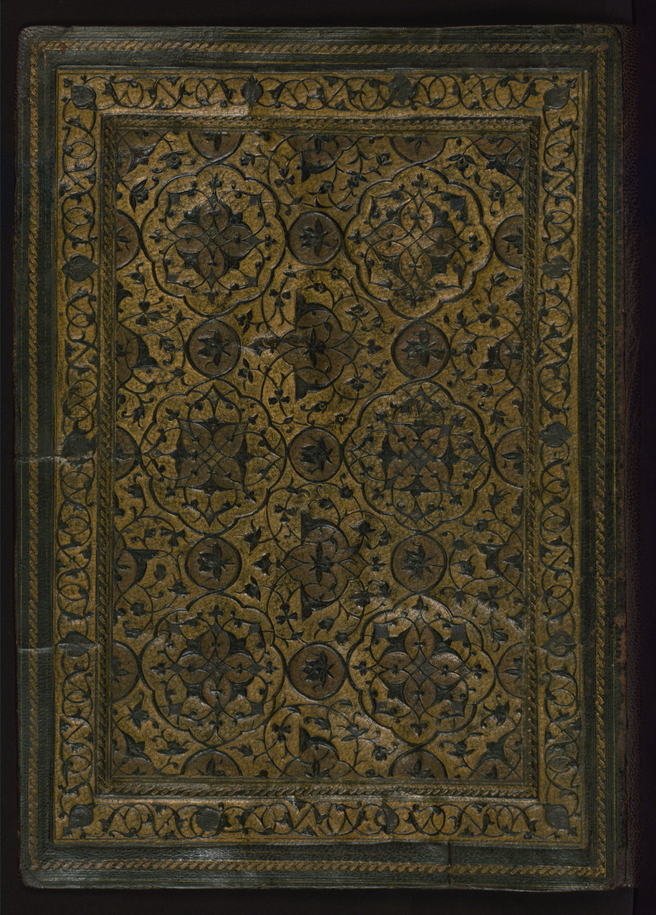 Walters manuscript W.579 is bound in a brown leather binding (with a flap). The binding is decorated with interconnected gold-tooled lobed medallions and discs with vine and floral motifs. The binding also includes an inner frame with a vine and scroll motif, a gold-tooled outer frame, and doublures with a central lobed oval and corner pendants with filigree decoration on a blue ground.