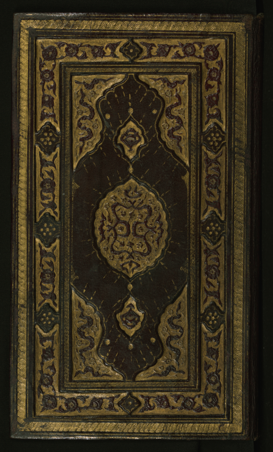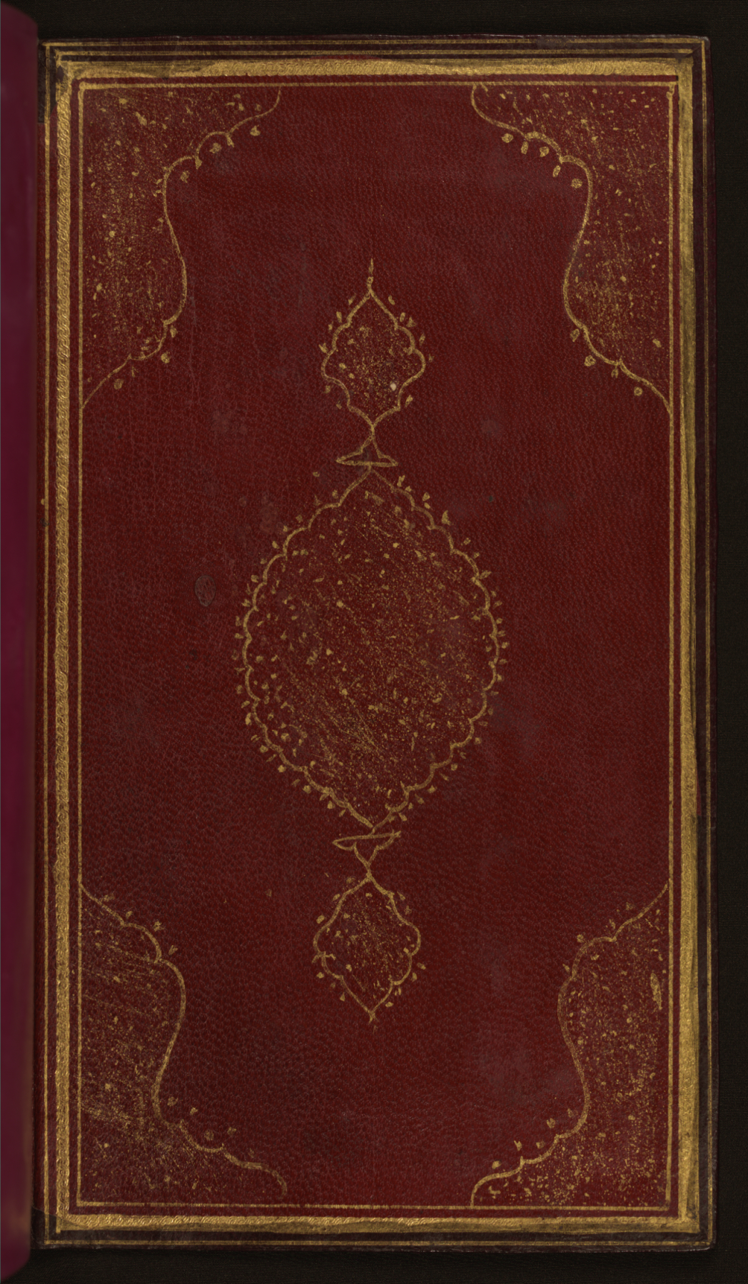 Walters manuscript W.586 has a contemporary binding of dark-brown leather with a flap. The binding is decorated with a lobed central oval with cornerpieces and borders.