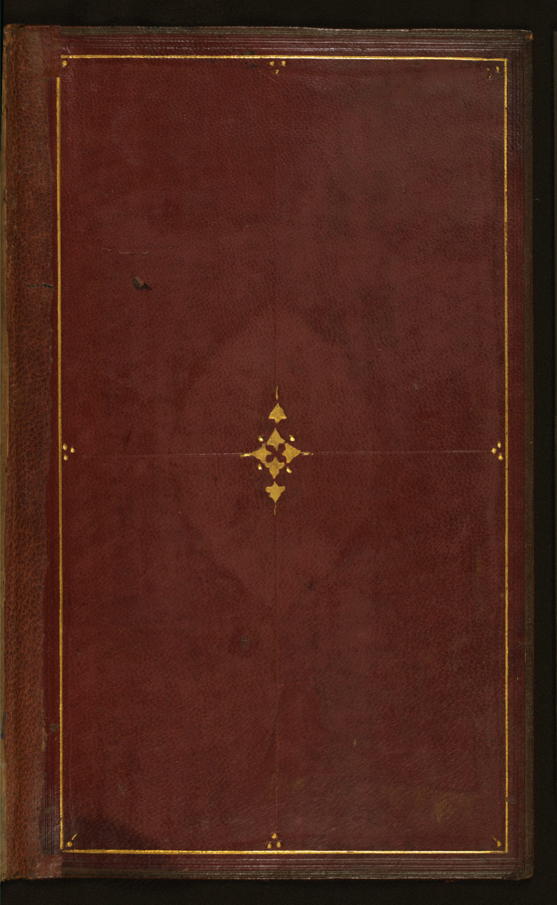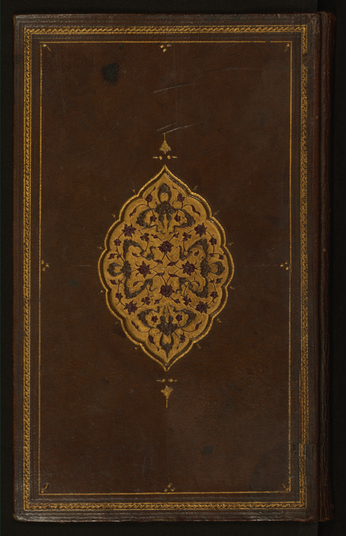 This binding from Walters manuscript W.591 is composed of brown goatskin with a large lobed oval and pendants and gold decorative frames. The binding is contemporary with the manuscript, which is dated to 918 AH/AD 1512.