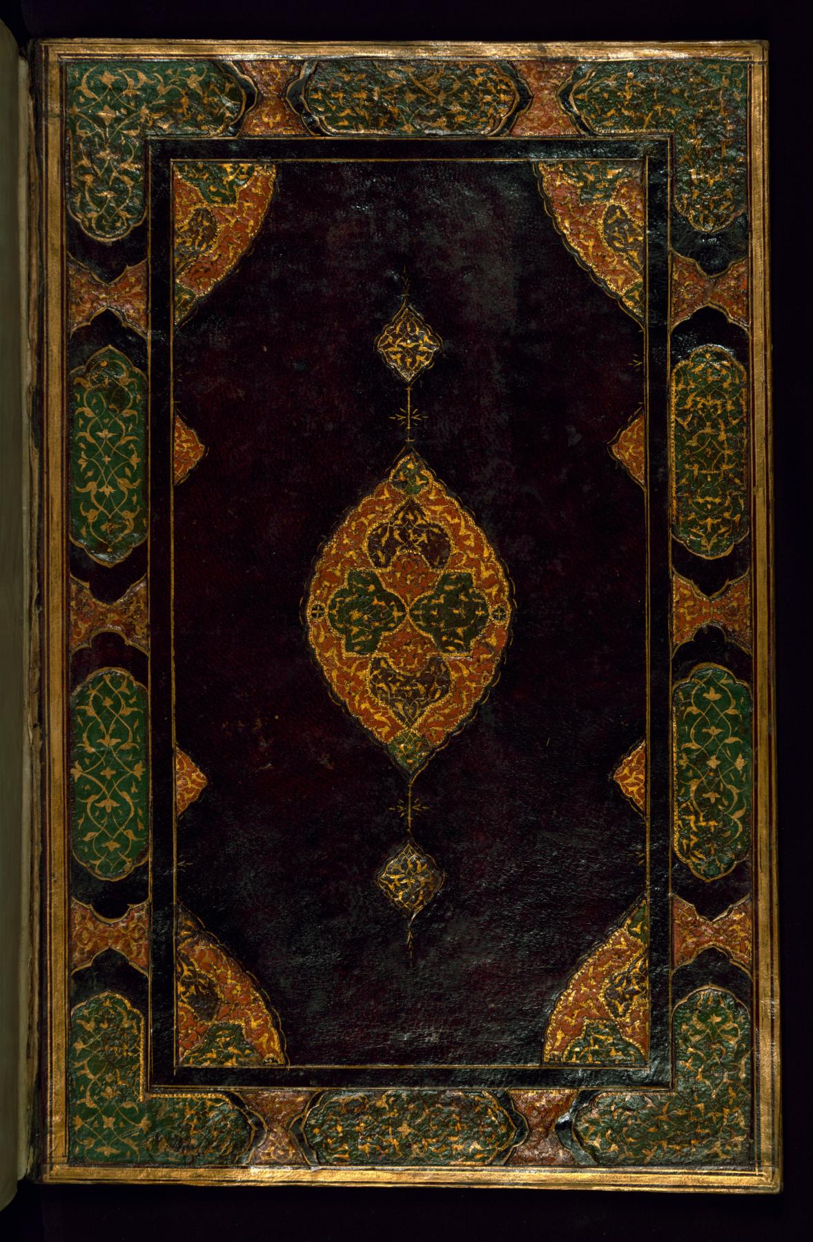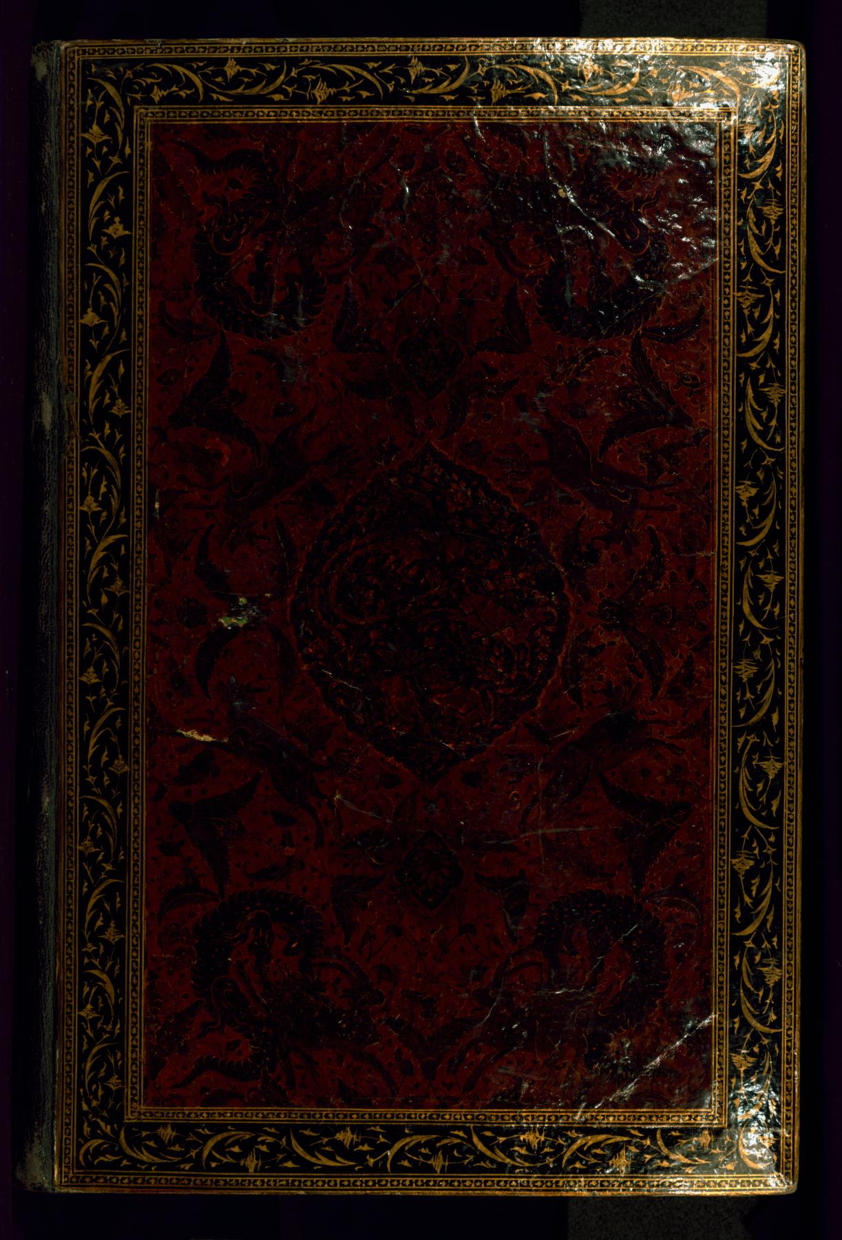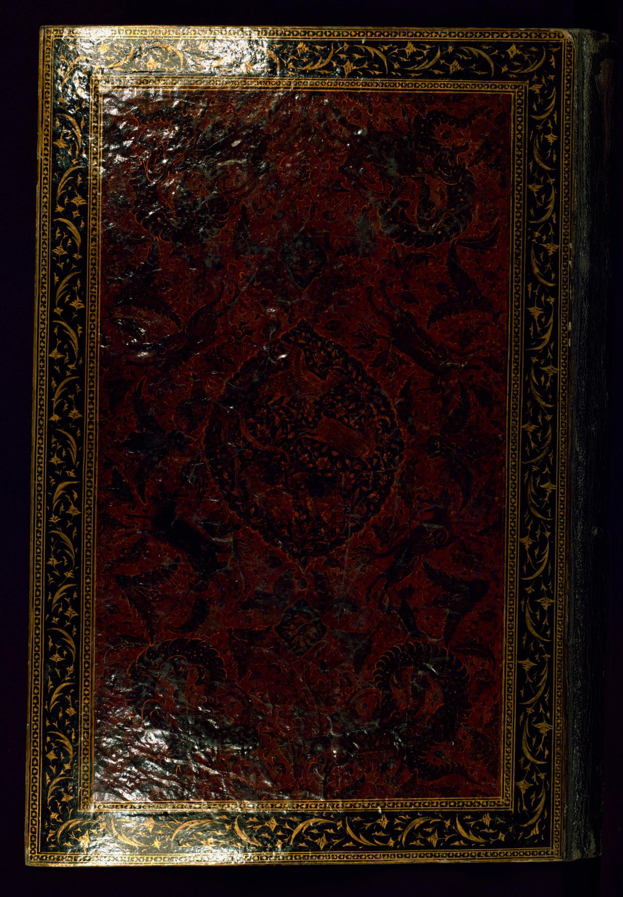 This non-original binding from Walters manuscript W.602 dates to the 13th century AH/AD 19th. It is composed of Qajar-style lacquer boards (no flap) and has central ovals and pendants decorated with animal scenes. The doublures are decorated with dentelle-style filigree work.