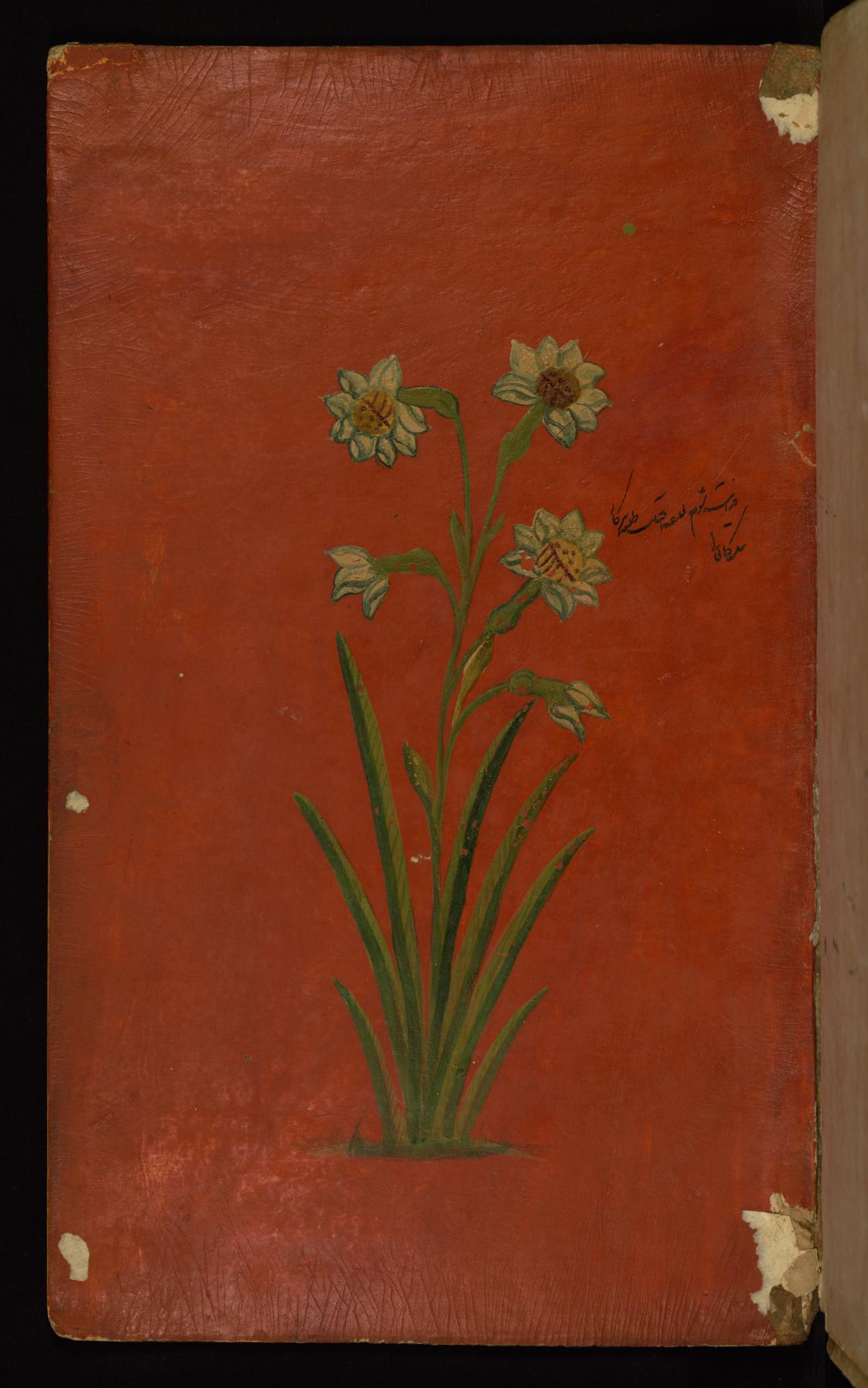 This black lacquer binding from Walters manuscript W.603 has a central oval and pendants and is decorated with gold flowers. The binding is not original to the manuscript, and dates to the 13th century AH/AD 19th. The binding also contains a painted doublure with a plant with yellow flowers (perhaps daffodils) that dates to the 13th century AH/AD 19th.