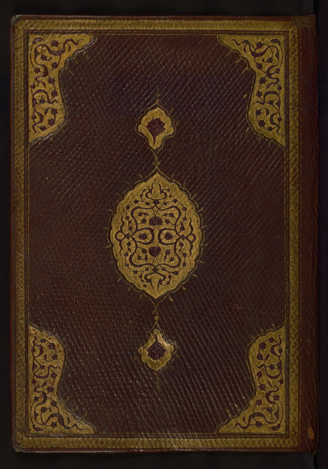 This non-original binding from Walters manuscript W.605 probably dates to the12th century AH/AD 18th. The binding is composed of brown leather (with a flap), and has stamped, gold-brushed central ovals, pendants, and cornerpieces. The binding has marbled endpapers. The first and last folios are mounted.