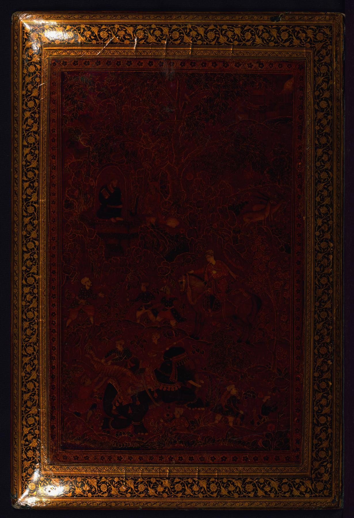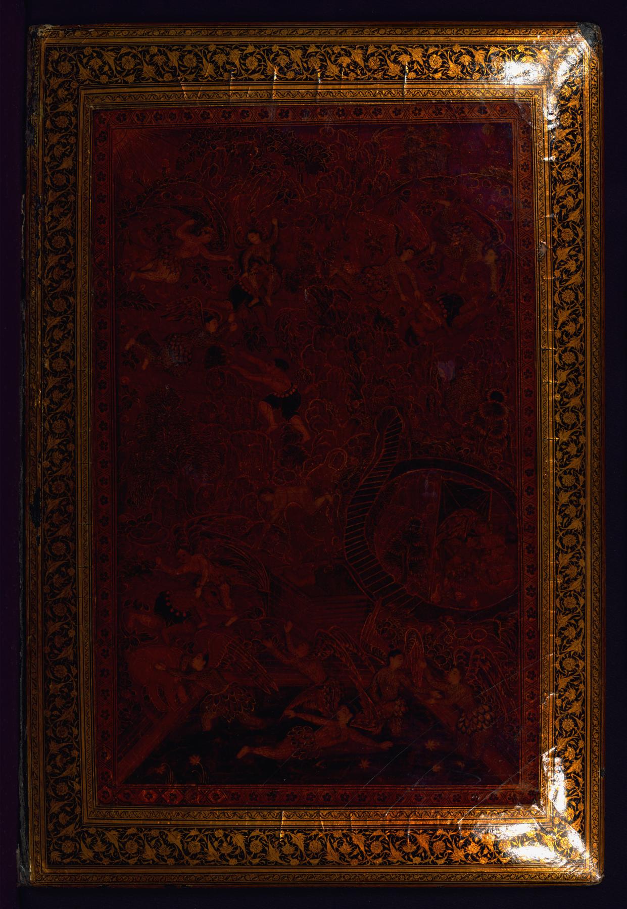 This binding from Walters manuscript W.624 is composed of lacquer with pictorial scenes. It is no longer attached to the manuscript and the covers are separated. The upper cover depicts an encounter between a prince and a reclusive sage; the lower cover depicts a host of fairies pummeling some outnumbered divs. The doublures are decorated with a field of small floral pattern. The binding was restored probably in Europe in the 13th century AH/AD 19th.
