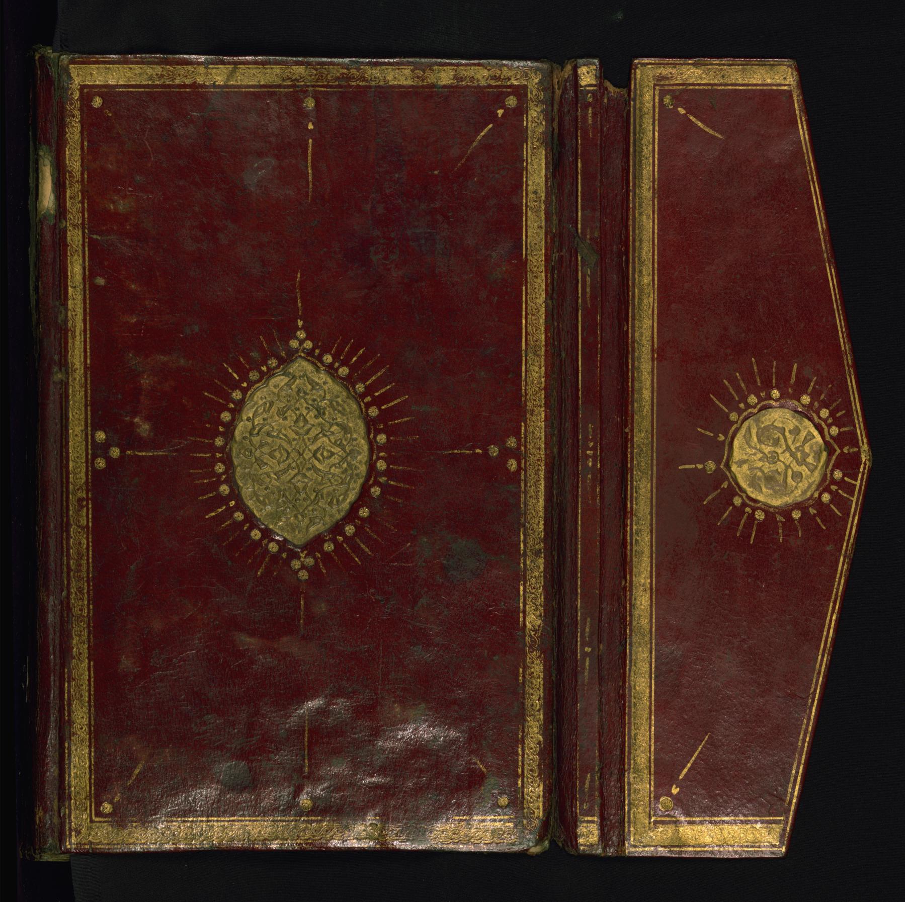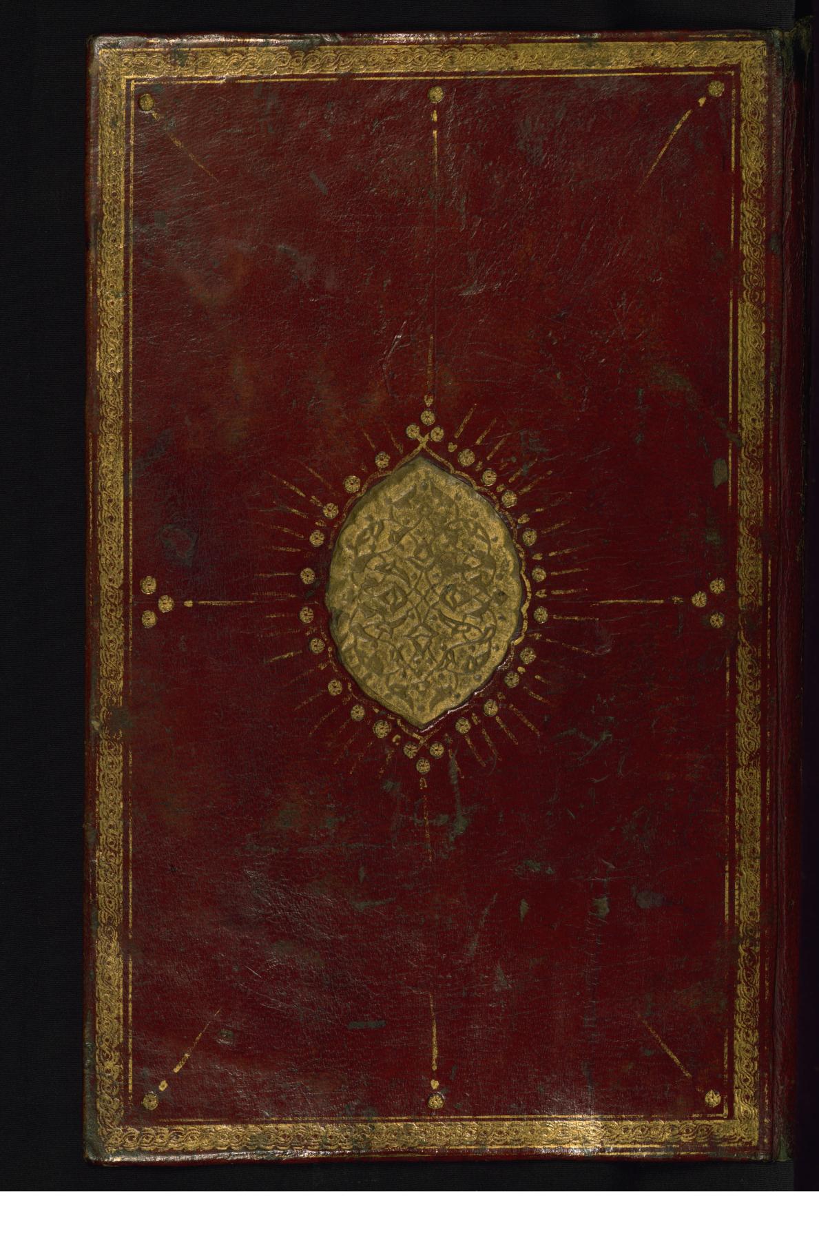 This non-original binding from Walters manuscript W.628 may be attributable to late 12th-century AH/AD 18th or 13th-century AH/AD 19th Turkey. The binding is composed of red leather with scalloped medallion and has gold-tooled decoration and borders.