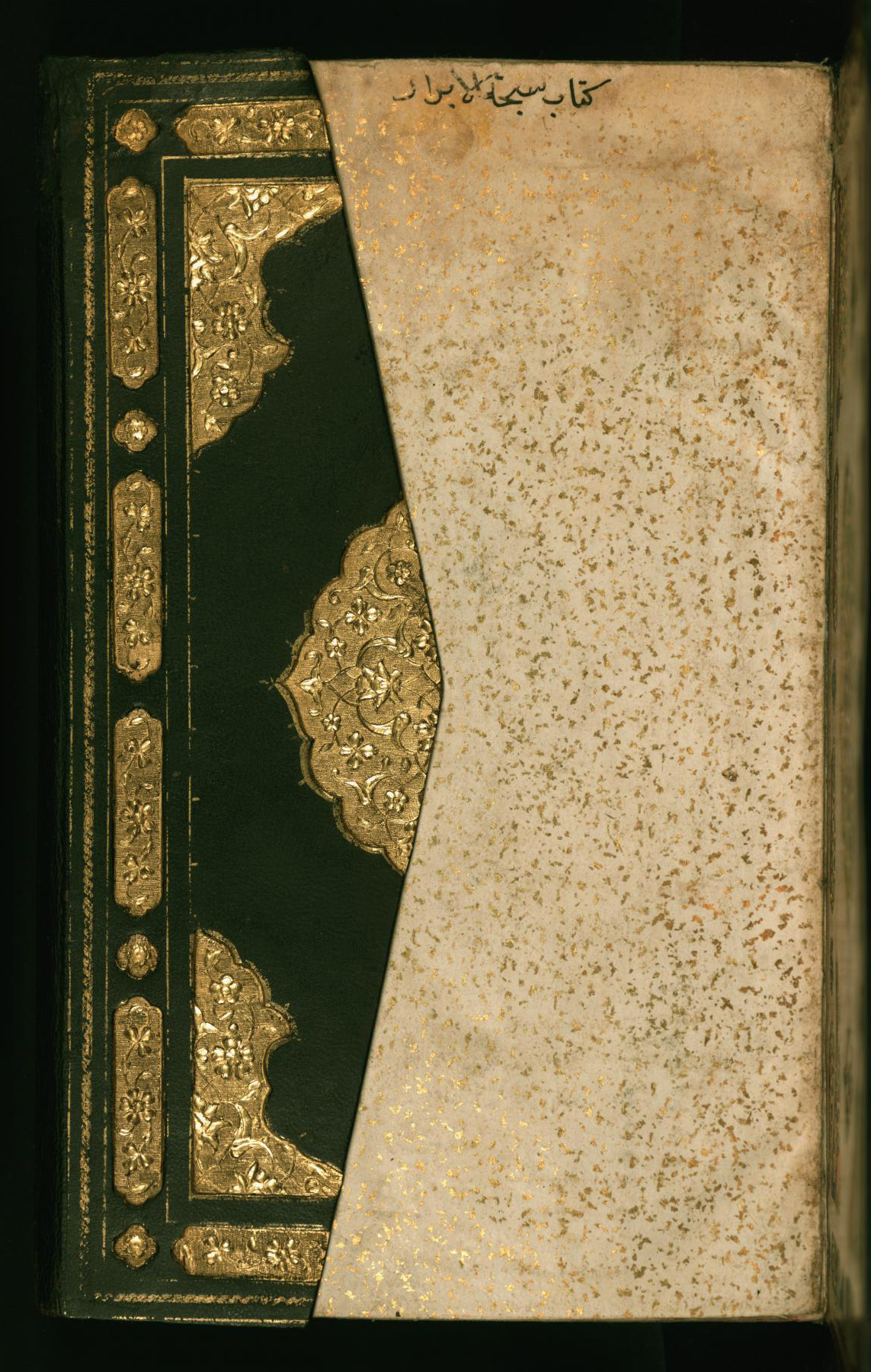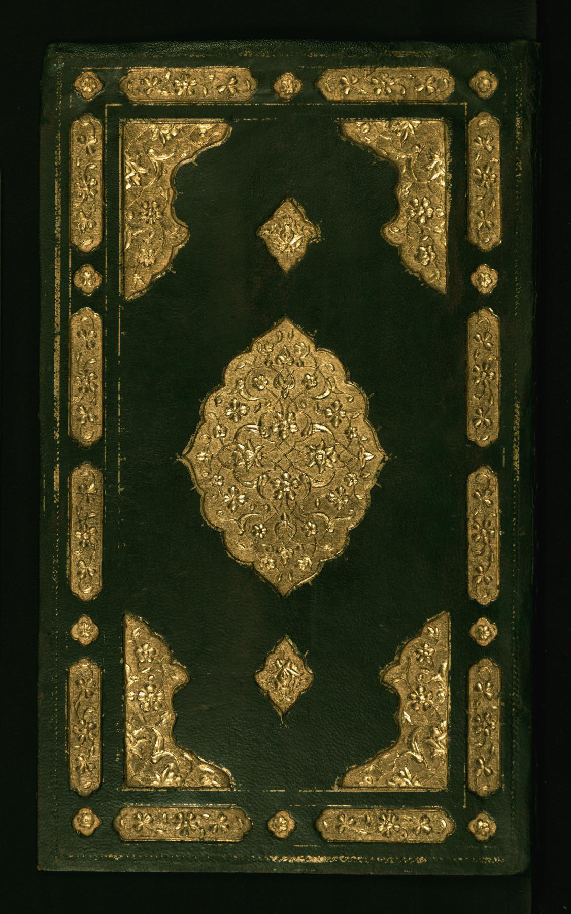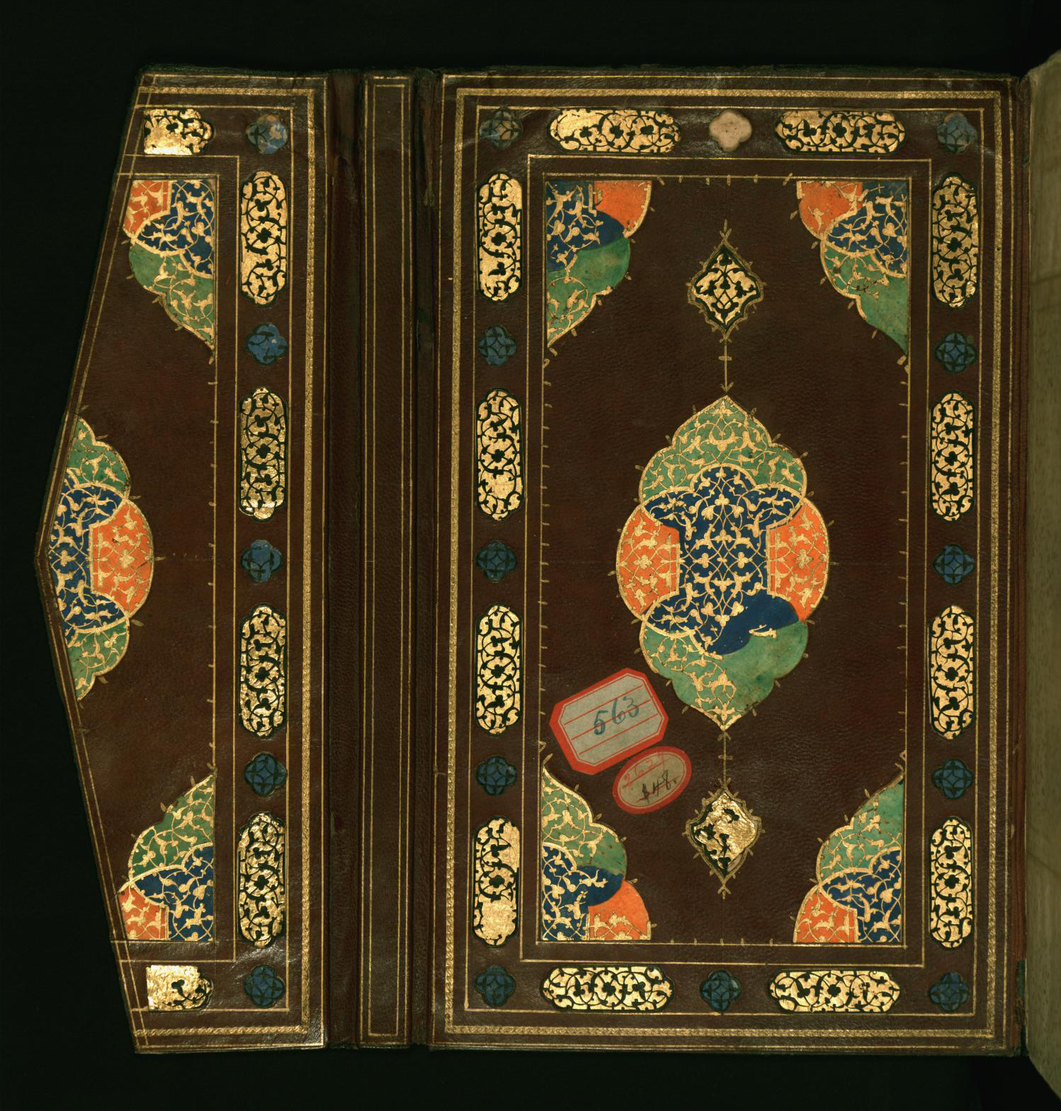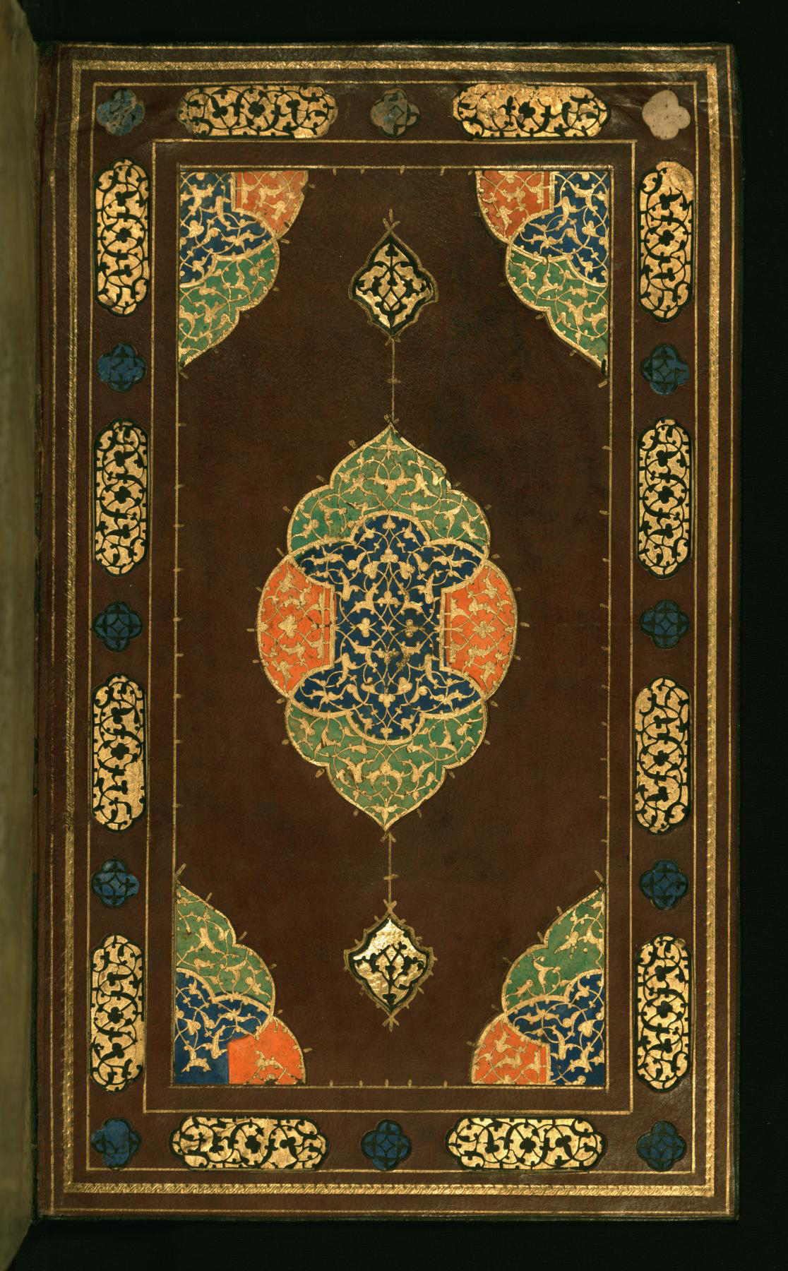 This dark brown goatskin binding with flap from Walters manuscript W.642 is a Safavid binding produced in 16th-century Iran. The central lobed medallion, pendants, and cornerpieces are brushed with gold. There is a wide border with cartouches in gold with floral motifs alternating with small quatrefoils with raised flowers.