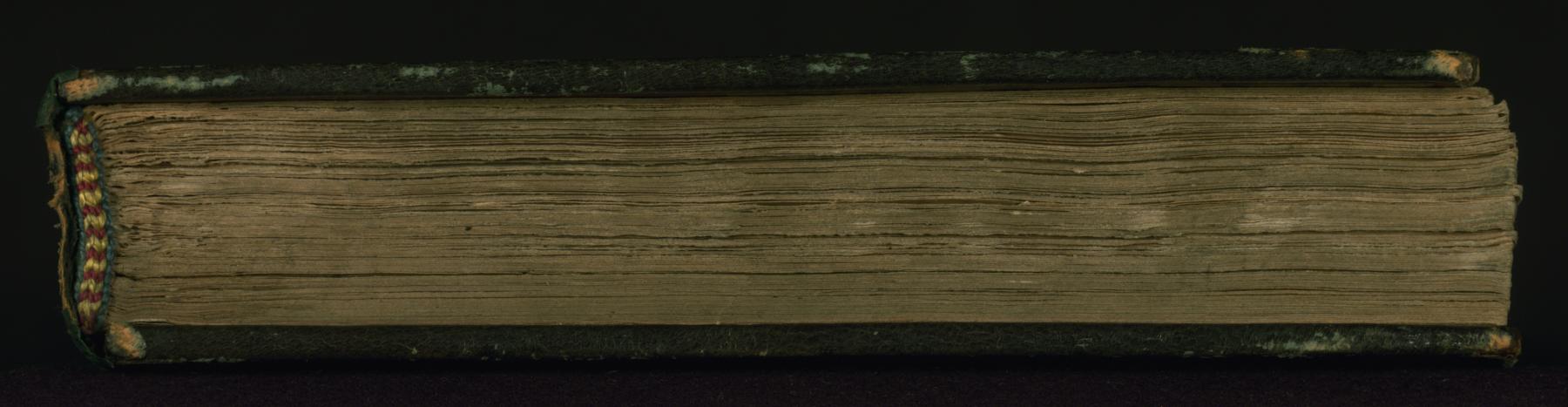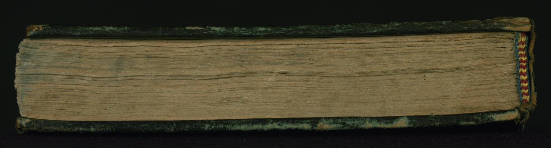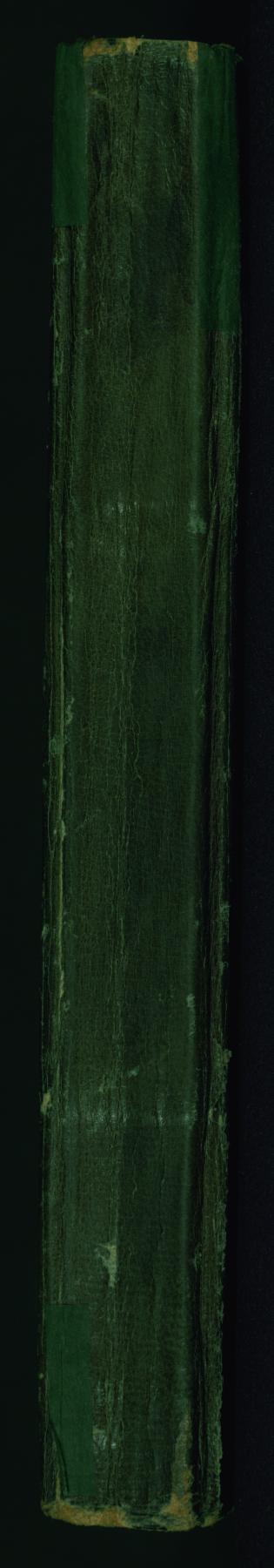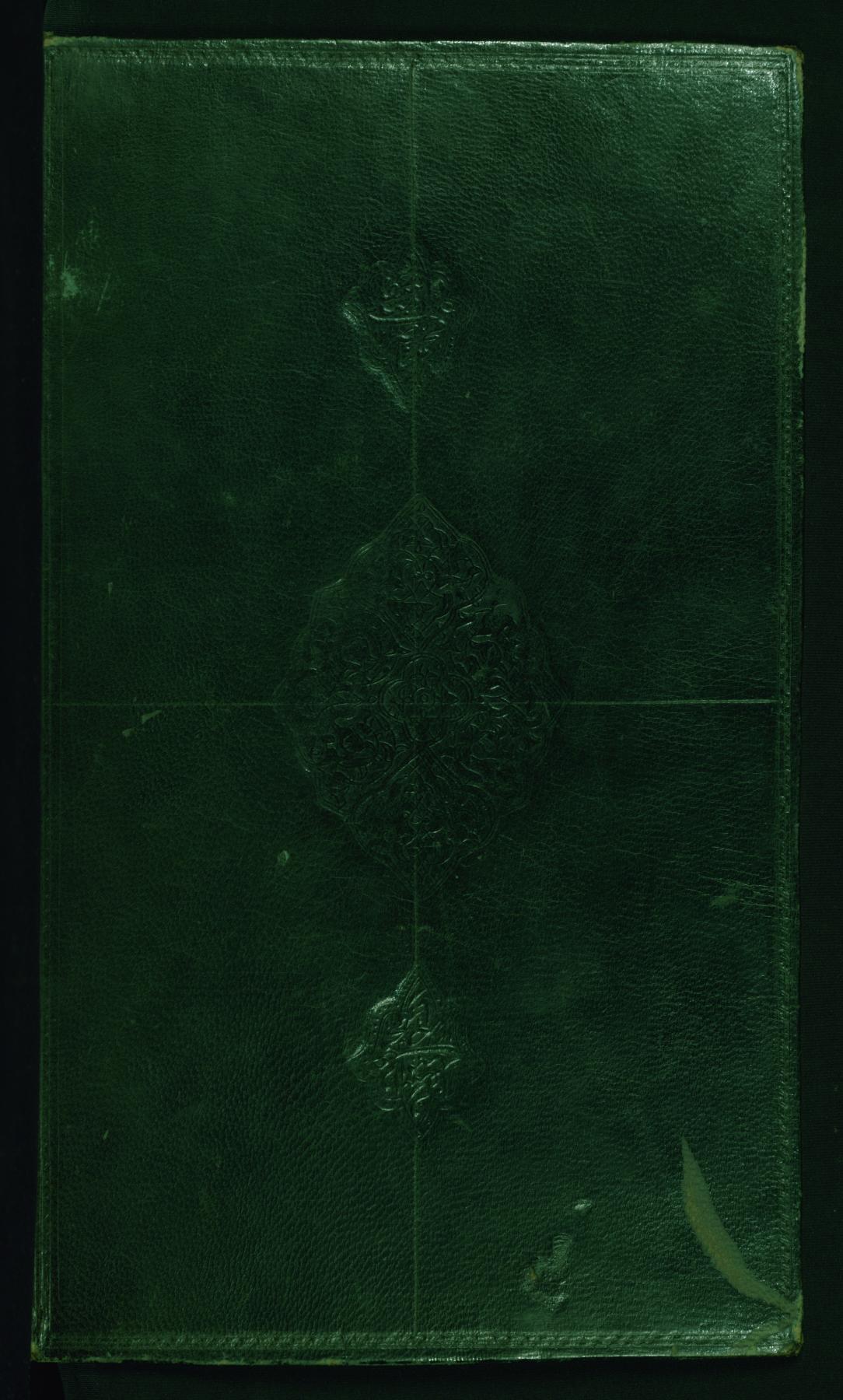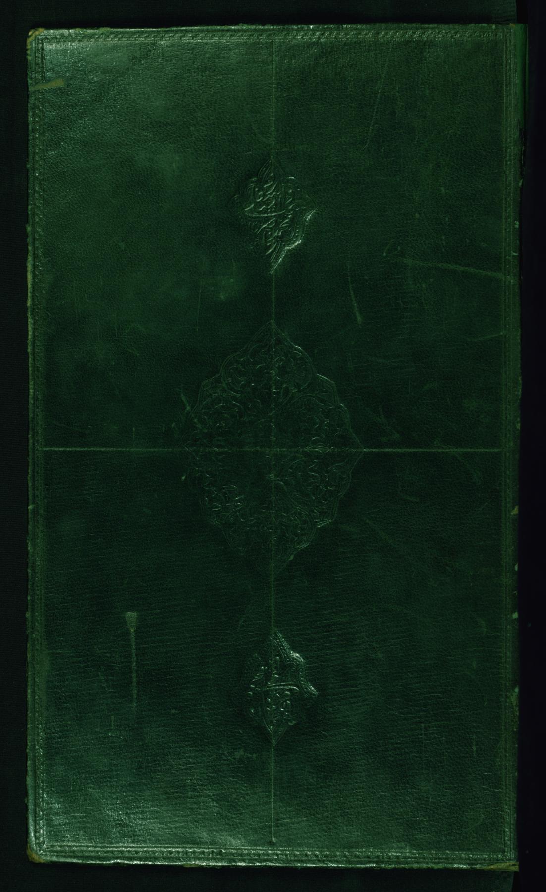 This non-original binding from Walters manuscript W.648 is attributable to the 13th century AH/AD 19th. The binding is composed of green leather and has no flap. It has a blind-stamped central oval and pendants and the inner boards are lined with ikat textile.