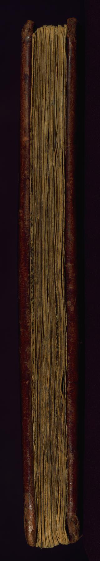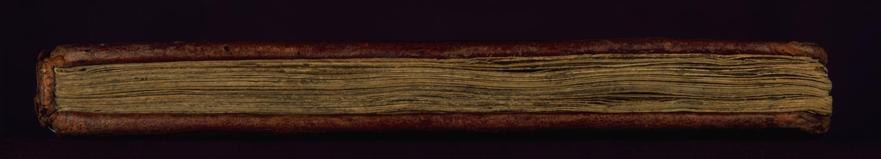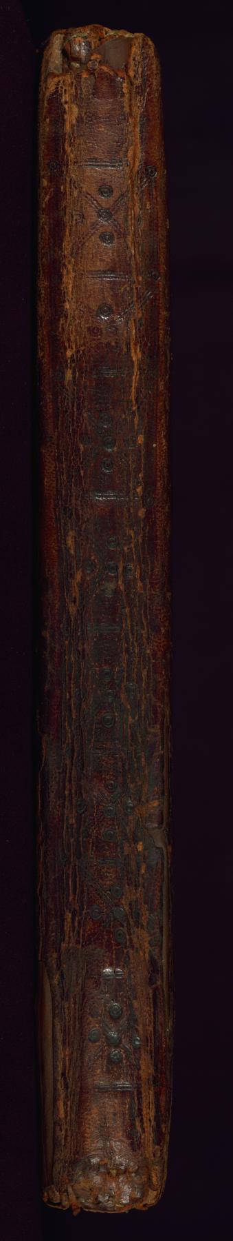 Binding is original. Blind-tooled, stamped goatskin with cross design over wooden boards.