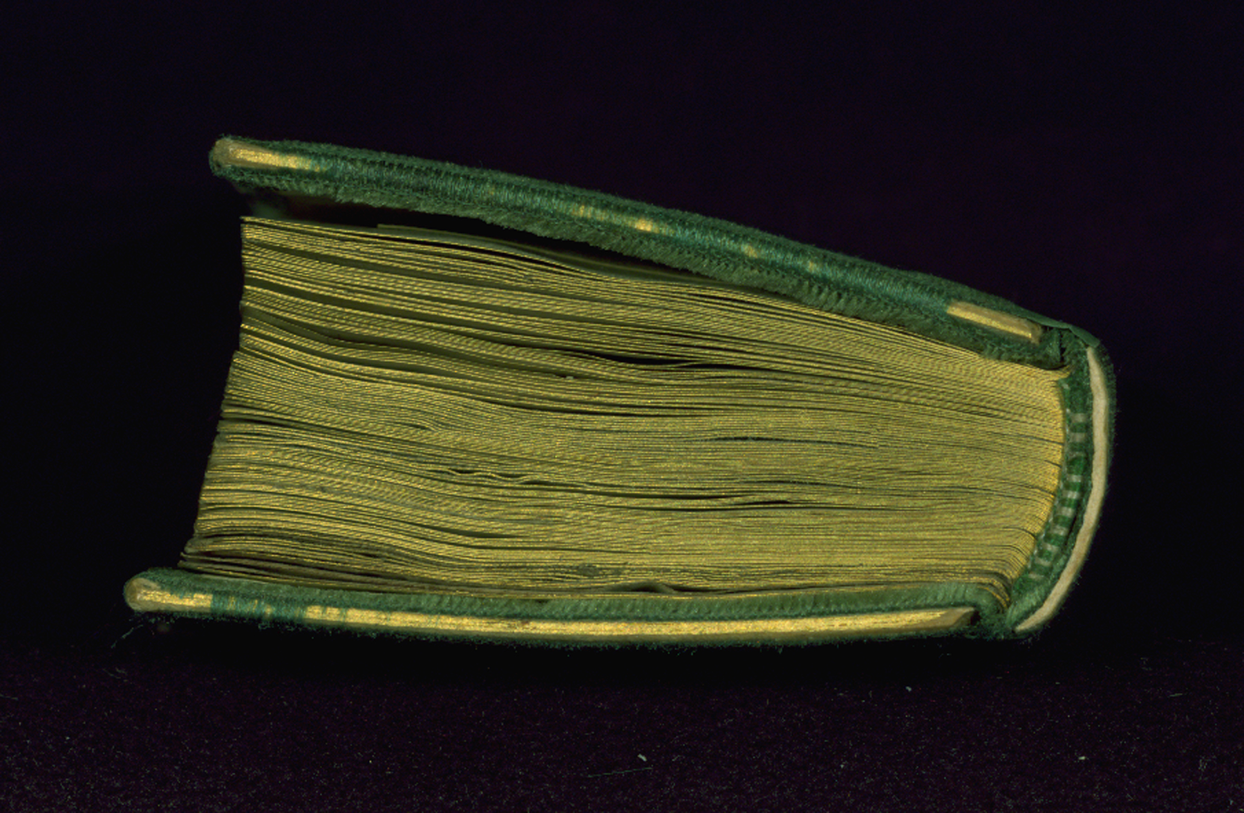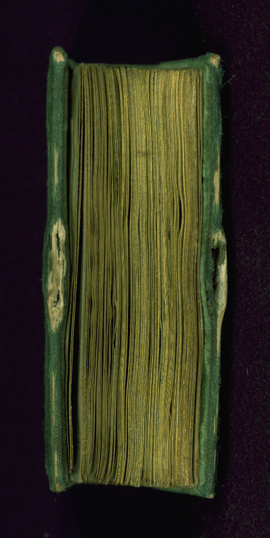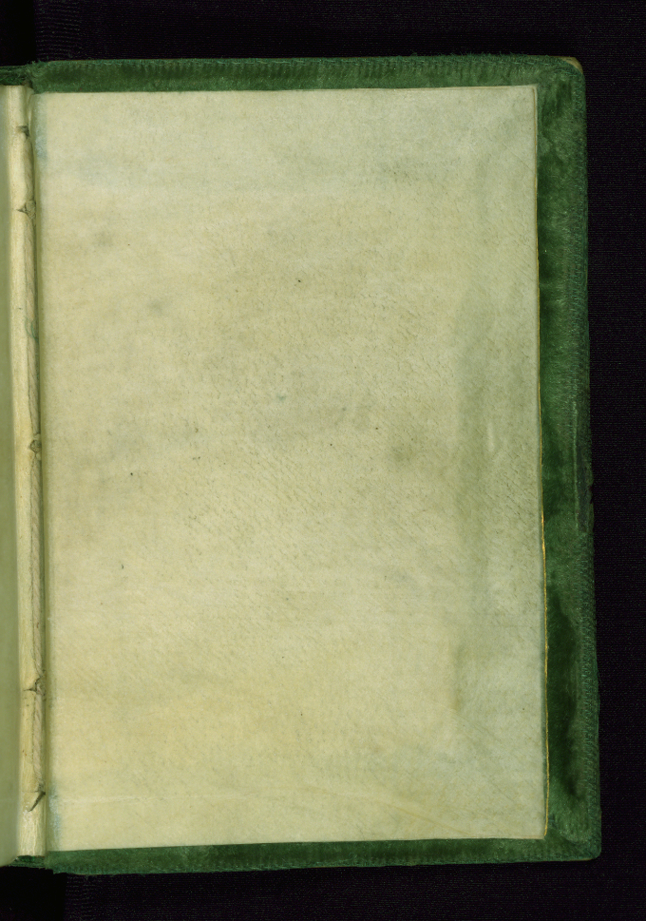 French green velvet binding, now mostly worn away, from the late nineteenth or early twentieth century, and likely by Léon Gruel. It is tightly sewn, with white and green silk endbands and gilded edges. Traces of a fastener is visible in the middle of fore-edge on both boards.