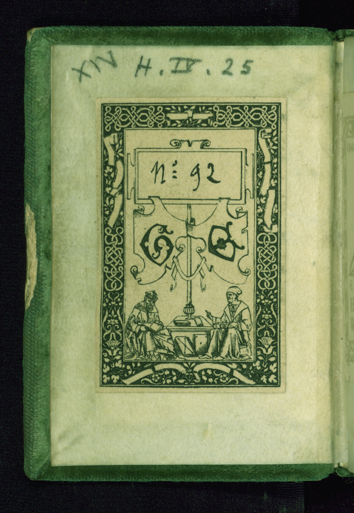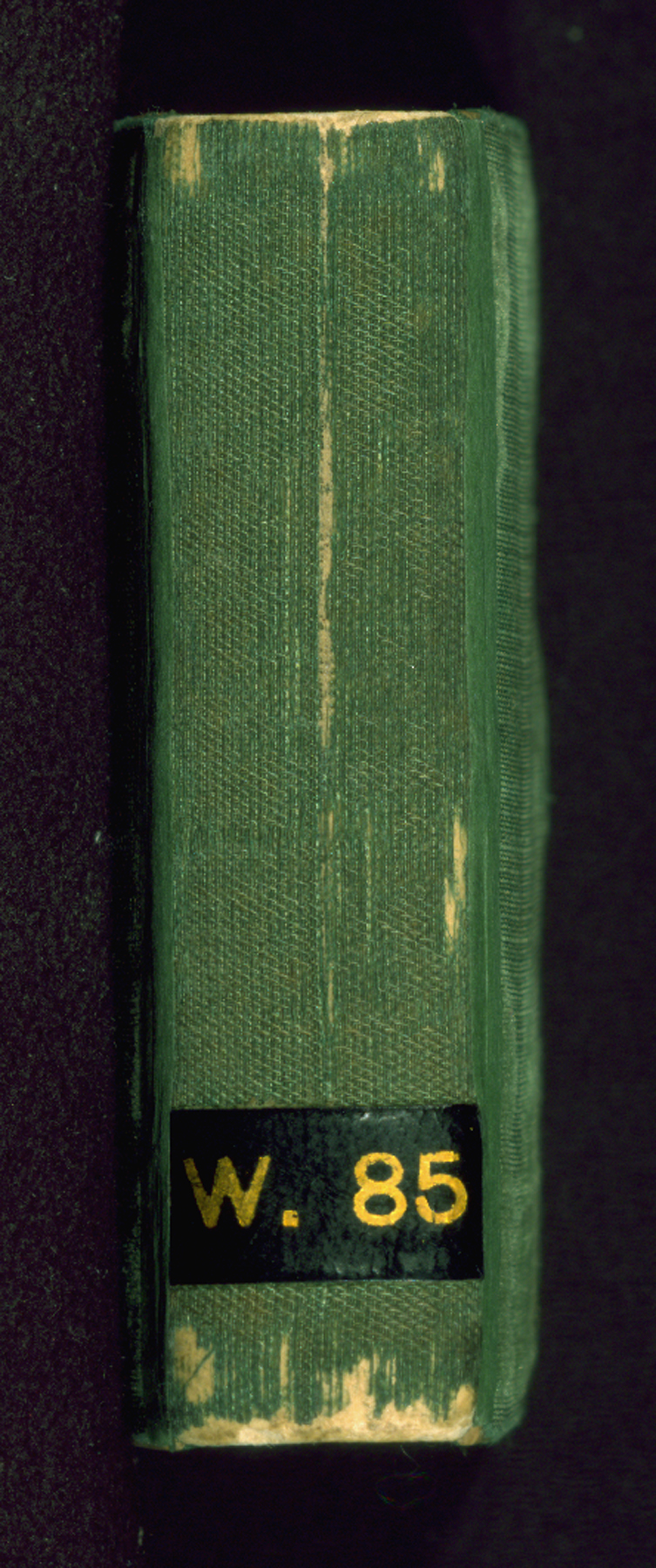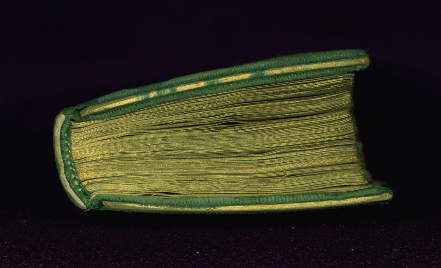 French green velvet binding, now mostly worn away, from the late nineteenth or early twentieth century, and likely by Léon Gruel. It is tightly sewn, with white and green silk endbands and gilded edges. Traces of a fastener is visible in the middle of fore-edge on both boards.