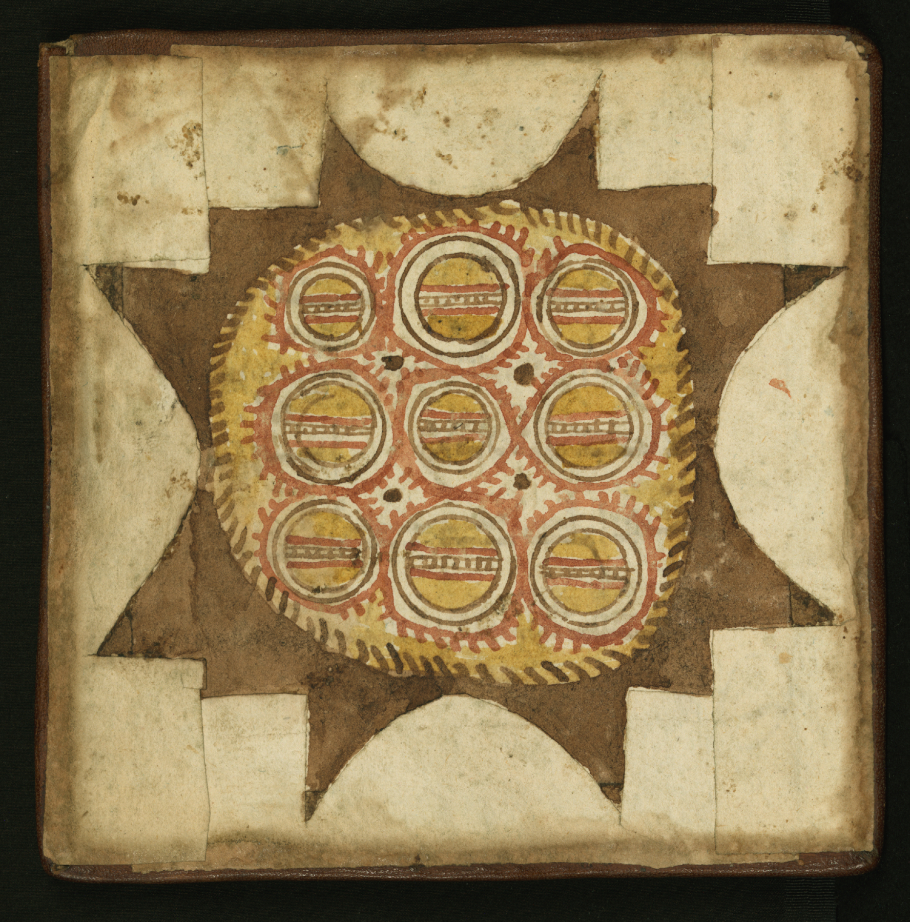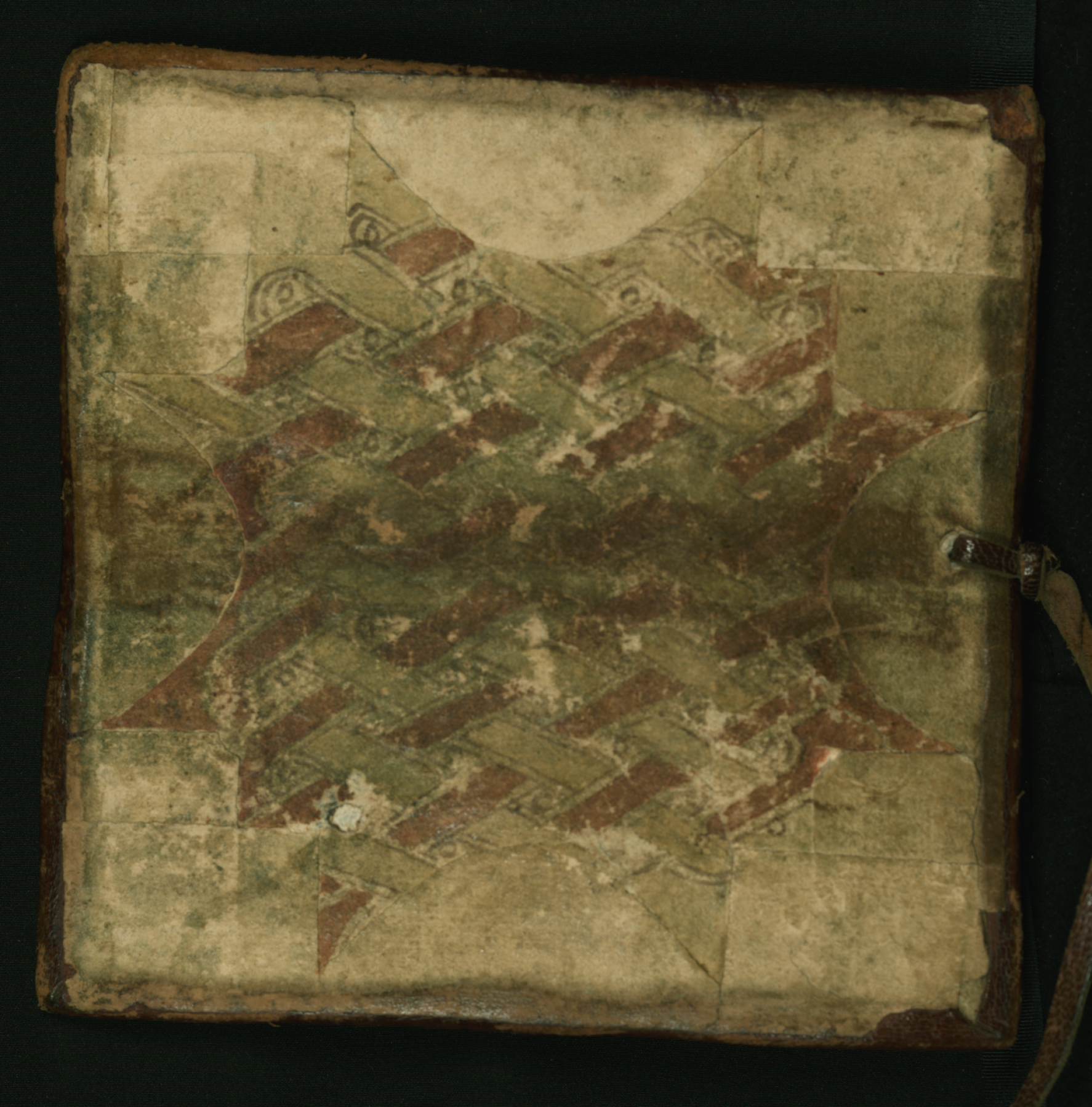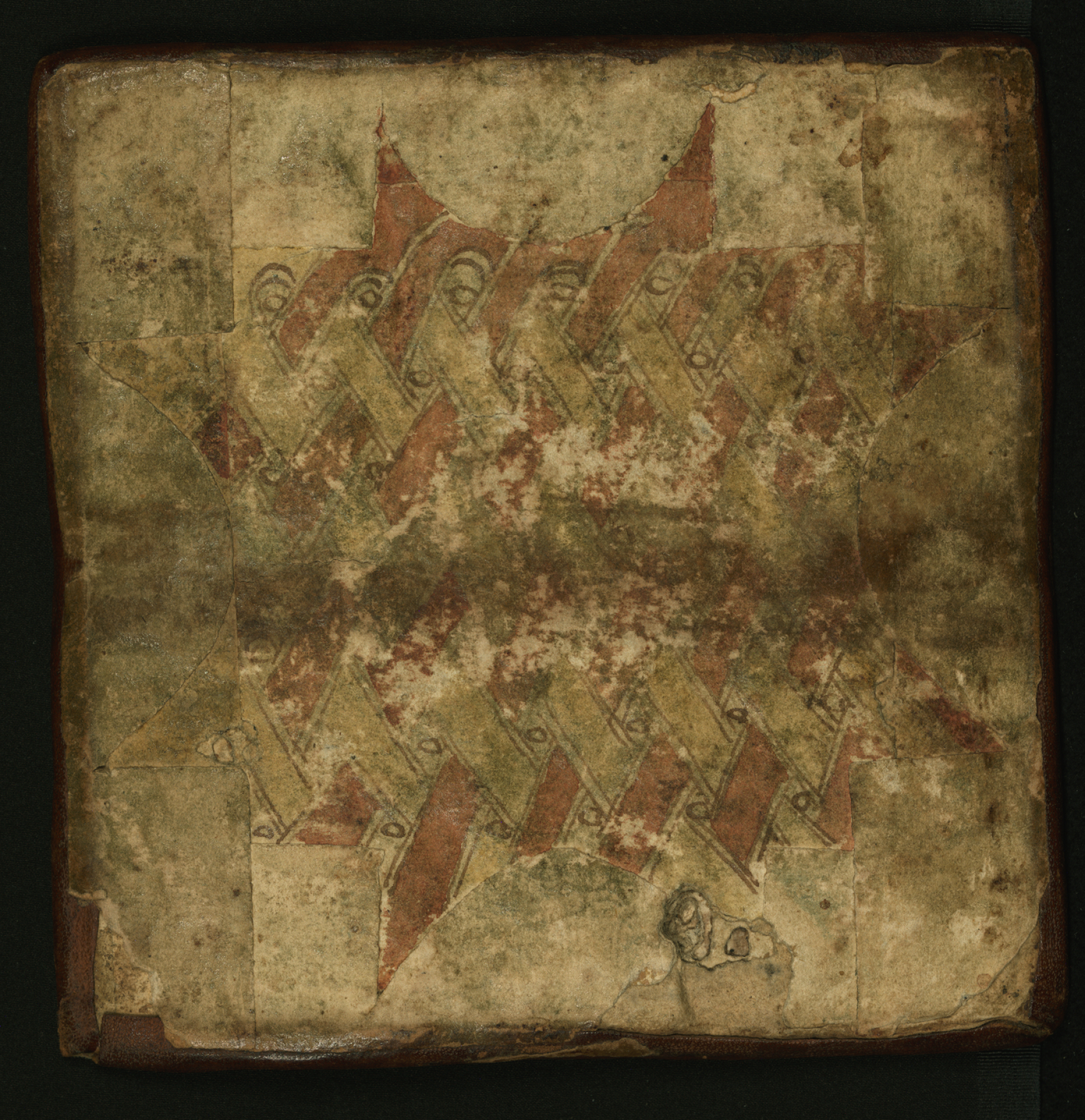 This binding from Walters manuscript W.853.1 is contemporary with the textblock. The upper board has a geometric design in a chevron pattern. The inside of this upper board is decorated with a star-shaped geometric design. The loose leaves of this Qur'an are sandwiched between this board and the lower board. It is common for Qur'ans from Muslim sub-Saharan Africa to assume this format.