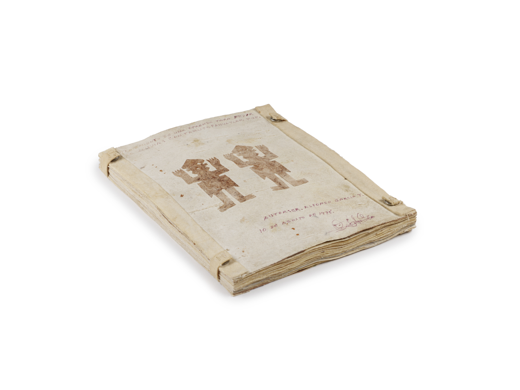 This is a handmade bark paper (amate) book created by Alfonso García Tellez, with writing by his daughter(s). Measuring 18 x 14 cm closed, the book is folded accordion style, with 28 numbered leaves plus covers, with snap closure system on both sides to hold book closed. Imagery in book is created out of 21 cut-out illustrations made from darker amate bark paper, with an additional two cut figures on the front cover, for a total of 23 figures overall. The text is in Spanish, and is handwritten in black ink by García Tellez’s daughter following his dictation. The front cover is inscribed with the title, dated “10 de Agosto de 1978,” and signed by the author.